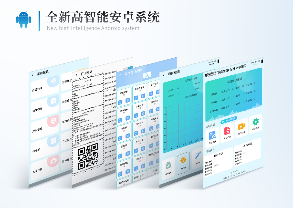| 儀器采用臺式一體化系統檢測技術,將分光光度模塊、新型農殘檢測模塊、數字化管理模塊、無線通訊模塊高度集成于一體,支持檢測200種食品安全檢測項目,同時預留升級檢測方法。 | 儀器檢測模塊標準化、智能化,可隨意自由組合。檢測箱體內置多個標準檢測單元,檢測模塊可以調整配置。 | 儀器采用全新安卓智能系統,主控芯片采用 ARM Cortex-A7,RK3288/4核處理器,10.1寸高清液晶觸摸豎屏,更加**的UI交互界面,運轉快捷;儀器配備無線通信模塊: 4G(APN)通訊模塊、Wifi模塊,藍牙傳輸,同時具有雙USB接口以及RJ45接口能以多種方式實現數據保存和數據傳輸功能。 | 創新檢測模式: | ★檢測通道:≥12通道;采用精密旋轉比色池設計,使用同芯片同光源校準精度,解決不同光源之間的誤差值。1-12通道間誤差0.1%。(***:**202022821055.2) | ★儀器具有自動識別比色皿檢測功能,即:將樣品比色皿放入儀器后,點擊樣品檢測,儀器自動識別比色皿進行通道檢測。 | 進口高精光源: | 高精度進口四波長冷光源,通道配置 410、520、590、630nm 波長光源,一個光源芯片驅動一個光源,誤差極小,每臺設備單獨**校準光源,**比對,同時參照四種不同波段光源全方位覆蓋市面上99%的農殘食品項目檢測。 | 智能化操作系統: | 便捷操作系統:設備檢測時可在同一檢測界面自動對應相關檢測通道一次性選擇1-12個樣品名稱,無須退出界面,節省操作時間。 | 數據集成系統:設備首頁自動統計檢測數據包含:周檢測數據、月檢測數據,全部檢測總數量,均包含檢測總數,合格數,不合格數,以及相關柱形分析圖,對各項檢測數據清晰掌握,無需電腦查詢,更加快捷直觀。 | 項目預設系統:支持添加單個及多個相同或不相同的任務預設,一鍵快速調取,每一個任務分別可以設置不同的樣品、批次、編號、來源、備注、抽樣信息、檢測信息、受檢信息、復核信息等更多信息。無縫鏈接平臺和APP實時查看下發任務。 | 數據監管系統:同步對接監管平臺,數據可局域網和互聯網數據上傳,檢測結果可選擇直接傳至食品安全監管平臺。集成OSS輸出存儲服務、區分設備定向管理應用,進行區域食品安全監管及大數據分析處理與數據統計,檢測區域食品安全長短期動態,達到食品安全問題預估、預警。 | 自定義打印系統:內置全新打印系統,新創自定義打印方式,可按需靈活設置開啟或關閉:產品合格證(國家農業部標準要求),二維碼,抽樣信息、檢測信息,受檢信息、復核信息、抽樣日期、檢測日期等信息的打印。 | 系統遠程更新功能:可定向分客戶分儀器更新系統,按照不同客戶后期實際需求添加項目,無需機器返廠,即可遠程實時升級全新系統,節省時間成本及避免運輸造成設備損壞。 | 儀器主機采用一體化防水、抗壓、防撞擊、防腐蝕箱體設計,同時配備交直流供電,可連接車載電源,可選配大容量充電鋰電池,滿足現場野外檢測需求。 | 安全證書,放心保障:儀器具有中國計量科學研究院校準證書,權威認證。 |