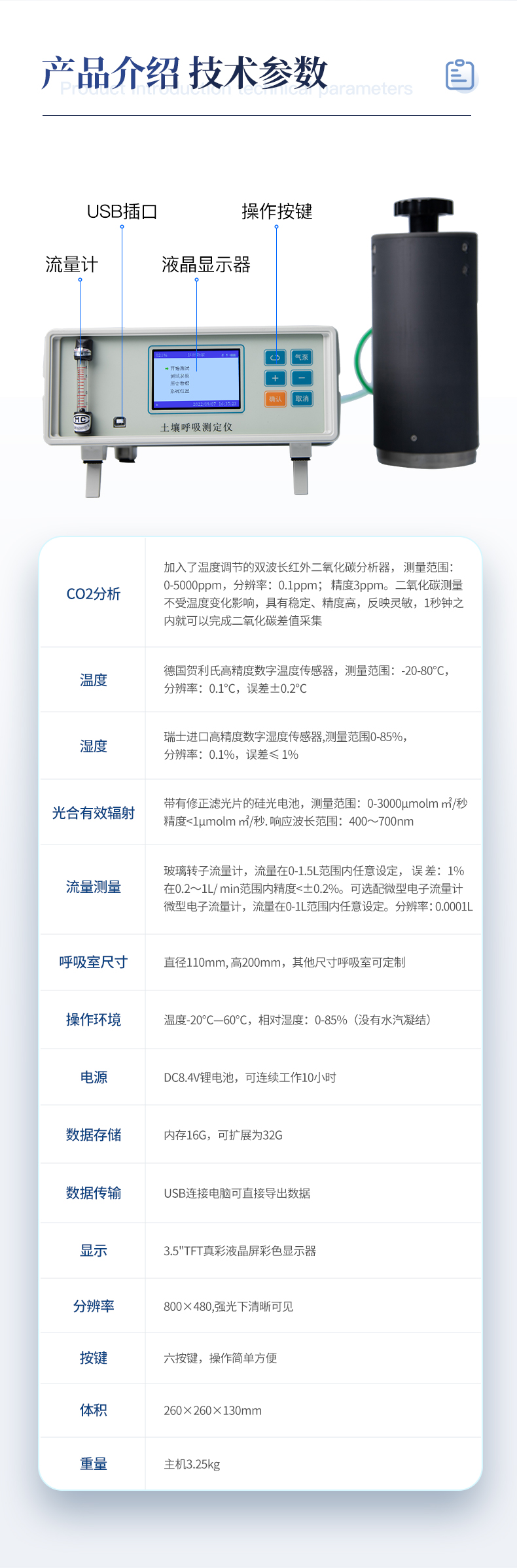 | CO2分析: | 加入了溫度調節的雙波長紅外二氧化碳分析器, 測量范圍:0-5000ppm,分辨率:0.1ppm; 精度3ppm。二氧化碳測量不受溫度變化影響,具有穩定、精度高,反映靈敏,1秒鐘之內就可以完成二氧化碳差值采集。 | 溫度:德國賀利氏高精度數字溫度傳感器,測量范圍:-20-80℃,分辨率:0.1℃,誤差±0.2℃ | 濕度: 瑞士進口高精度數字濕度傳感器,測量范圍0-85%,分辨率:0.1%,誤差≤ 1% | 光合有效輻射:帶有修正濾光片的硅光電池,測量范圍:0-3000μmolm ㎡/秒 ,精度<1μmolm> | 流量測量:玻璃轉子流量計,流量在0-1.5L范圍內任意設定, 誤 差:1%,在0.2~1L/ min范圍內精度<±0.2%。可選配微型電子流量計,微型電子流量計,流量在0-1l范圍內任意設定。分辨率:0.0001l<> | 呼吸室尺寸:直徑110mm, 高200mm,其他尺寸呼吸室可定制。 | 操作環境:溫度-20℃—60℃,相對濕度:0-85%(沒有水汽凝結) | 電源:DC8.4V鋰電池,可連續工作10小時 | 數據存儲:內存16G,可擴展為32G。 | 數據傳輸:USB連接電腦可直接導出數據。 | 顯 示:3.5"TFT真彩液晶屏彩色顯示器 | 分辨率 800×480,強光下清晰可見 。 | 按 鍵:六按鍵,操作簡單方便 | 體積:260×260×130mm | 重量:主機3.25kg | 可選配:土壤水分溫度傳感器 |