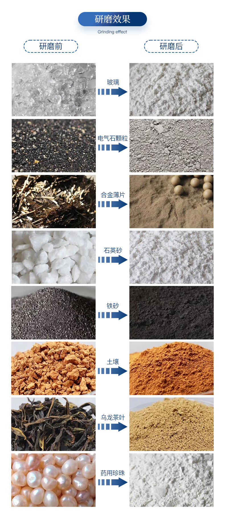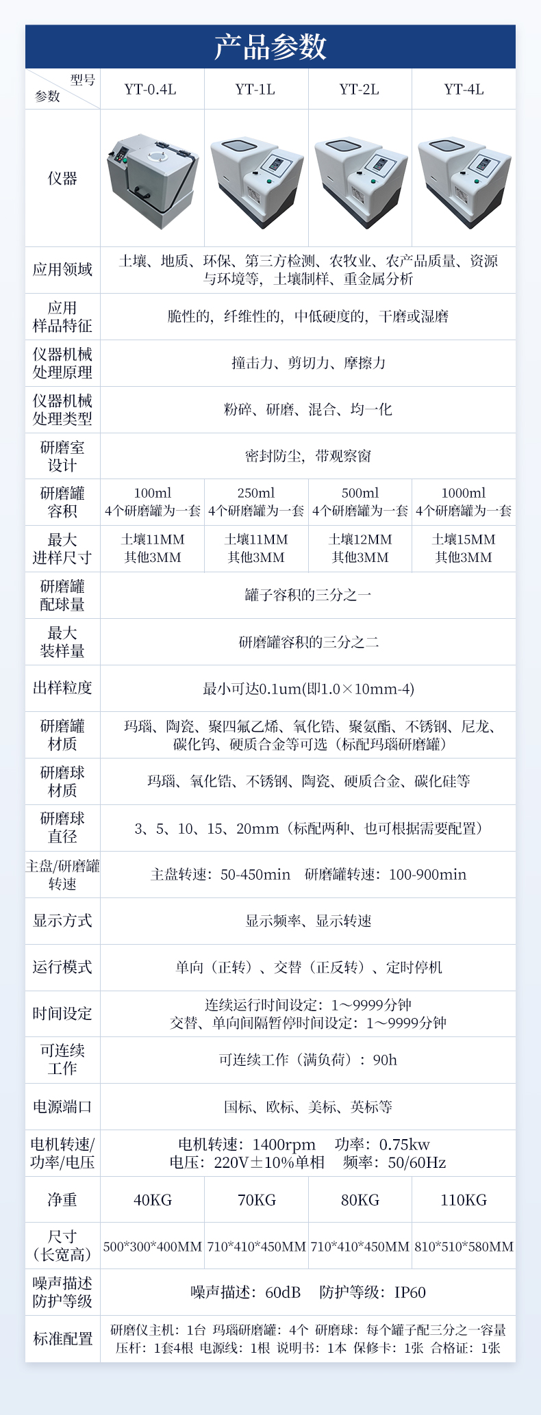 | 應(yīng)用領(lǐng)域:土壤、地質(zhì)、環(huán)保、第三方檢測、農(nóng)牧業(yè)、農(nóng)產(chǎn)品質(zhì)量、資源與環(huán)境等,土壤制樣、重金屬分析 | 應(yīng)用樣品特征:脆性的,纖維性的,中低硬度的,干磨或濕磨 | 儀器機(jī)械處理原理:撞擊力、剪切力、摩擦力 | 儀器機(jī)械處理類型:粉碎、研磨、混合、均一化 | 控制系統(tǒng):觸摸屏、無線遙控 | 遠(yuǎn)程遙控:標(biāo)配無線遙控器,可遠(yuǎn)距離控制研磨機(jī)的啟動、停止、加速、減速以及可切換三種運(yùn)行模式(單向持續(xù)運(yùn)行,單向間隔運(yùn)行,雙向交替間隔運(yùn)行) | 顯示方式:7.0寸彩色液晶顯示屏,可顯示、觸控操作運(yùn)行模式、運(yùn)行時間、轉(zhuǎn)速、交替運(yùn)行間隔 | 運(yùn)行模式:單向持續(xù)運(yùn)行、單向間隔運(yùn)行、雙向交替間隔運(yùn)行、定時停止 | 連續(xù)運(yùn)行時間設(shè)定:0.1~9999.9分鐘 | 交替、單向間隔暫停時間設(shè)定:0.1~9999.9分鐘 | 主盤轉(zhuǎn)速:50-450min | 研磨罐轉(zhuǎn)速:100-900min | 傳動比(行星盤、研磨罐):1:2 | 可連續(xù)工作(滿負(fù)荷):90h | 緊急停機(jī):紅色急停按鈕可一鍵斷電停機(jī) | 斷電記憶功能:斷電之前的時間設(shè)定,斷電開機(jī)后無須重新設(shè)定 | 過載保護(hù)功能:有 | 研磨室設(shè)計:密封防塵,帶四方位觀察窗 | 同時處理樣品種數(shù):4種 | 適用研磨罐:本機(jī)是新款通用型,100ml、250ml、500ml三種規(guī)格研磨罐均可使用,可根據(jù)客戶需求同時放不同規(guī)格的罐;對角對稱即可(4個研磨罐為一套)。 | **進(jìn)樣尺寸:土壤12mm 其他3mm | 研磨罐配球量:罐子容積的三分之一 | **裝樣量:研磨罐容積的三分之二 | 出樣粒度:*小可達(dá)0.1um(即1.0×10mm-4) | 研磨罐材質(zhì):瑪瑙、陶瓷、聚四氟乙烯、氧化鋯、聚氨酯、不銹鋼、尼龍、碳化鎢、硬質(zhì)合金等可選(常用瑪瑙、氧化鋯研磨罐) | 研磨球材質(zhì):瑪瑙、氧化鋯、不銹鋼、陶瓷、硬質(zhì)合金、碳化硅等 | 研磨球直徑:3、5、10、15、20mm(根據(jù)實際需求配置) | 電源端口:國標(biāo)、歐標(biāo)、美標(biāo)、英標(biāo)等 | 電機(jī)轉(zhuǎn)速、功率、電壓:1400rpm、0.75kw、220V±10%單相,50/60Hz | 凈重:80kg | 尺寸(長寬高):756*484*488mm | 噪聲描述:60dB | 防護(hù)等級:IP60 | 標(biāo)準(zhǔn)配置:研磨儀主機(jī):1臺; | 研磨罐鎖緊裝置:1套4個; | 250ml研磨機(jī)研磨罐保護(hù)裝置:1套4個; | 100ml研磨機(jī)研磨罐保護(hù)裝置:1套4個; | 電源線:1根; | 說明書:1本; | 保修卡:1張; | 合格證:1張 |