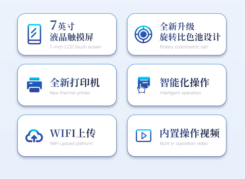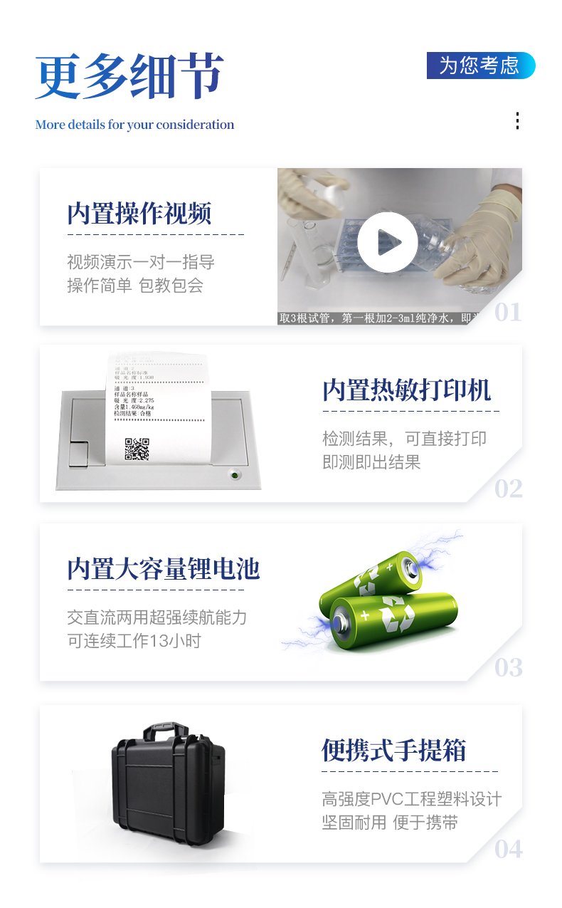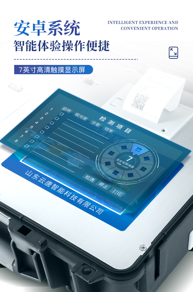 | ★1、Android安卓智能操作系統,主控芯片采用ARM Cortex-A7,RK3288/4核處理器,主頻1.88Ghz,運轉速度更快速,穩定性更強。 | ★2、采用精密旋轉比色池設計(***:** 2018 2 1777724.7),光源一致性更加**,保證檢測精度。 | ★3、12個旋轉檢測通道,一次性可快速檢測12個樣品,極大提升檢測效率,降低檢測成本。 | ★4、采用高精度濾光片技術自主專利分析方法(***:** 2020 2 1763837.9),權威認證。 | ★5、檢測過程中內置校準功能,智能恒流穩壓,光強自動校準,確保檢測準確度,取得中國計量科學研究院的《校準證書》。 | 6、儀器標配wifi無線上傳、4G聯網傳輸、GPRS無線遠傳功能,快速上傳數據。 | 7、配有智慧云農業平臺,儀器連入無線網絡后,可將檢測數據可選擇性或批量無線上傳,方便用戶進行長期數據管理和可視化分析。 | 8、儀器同時具有USB接口、以太網接口,內置大容量內存,并可隨時用U盤拷貝數據。 | 9、可用手機隨時登錄云平臺在線移動查看歷史數據 | 10、內置作物專家施肥系統,可對百余種全國農業經濟作物、果樹等的目標產量計算推薦施肥量,依據施肥配方科學指導農業生產。測土配方施肥結果可打印,打印內容包含:作物種類、肥料種類、目標產量、需求總量、建議施肥方案。 | 11、內置植物營養診斷標準圖譜,根據各農作物營養缺失的圖片,進行葉面對比,診斷豐缺。 | 12、4波長專業測試冷光源(紅、藍、綠、橙),光源波長穩定,長時間連續工作光源無溫漂現象,壽命長達10萬小時級別,重現性好,準確度高。 | 13、比色池部分采用標準1cm比色皿,無機械位移及磨損,光路測試定位**,有效屏蔽外光干擾,保證檢測結果優于國標要求。 | 14、儀器系統內帶有樣品前處理操作視頻,各種樣品檢測方法點擊視頻模塊即可觀看,檢測人員無需自學說明書,指導教學方便快速,方便新手快速操作。 | 15、內置新一代高速熱敏打印機(無需色帶),打印內容包含:檢測單位、檢測人員、檢測項目、通道號、吸光度、養分含量(mg/kg)、檢測時間、以及二維碼等信息 | 16、高靈敏7寸真彩觸摸屏,采用更加**和人性化操作,高清晰高交互顯示,大程度降低傳統儀器的繁瑣操作和失誤,并取得多項《軟件著作權》。 | 17、內置時鐘功能,方便操作時間記錄,長期歷史追溯。 | 18、可設置多賬戶賬號密碼登錄,**UI交互界面,不同的用戶可自由添加編輯檢測信息,保存后可長期使用。 | 19、GPS功能:可在野外作業時記錄經緯度地點,滿足特殊用戶需求。 | 20、內置低電壓提示功能,可在檢測時明確電量,避免測試數據偏移,同時具有斷電保護功能,斷電自動保存數據,防止數據丟失。 | 21、交直流兩用供電方式,內置大容量充電鋰電池,滿電狀態下可連續工作10余小時,同時可外接車載電源蓄電。 | 22、儀器具有中英文切換功能,可滿足出口要求。 | 23、高強度PVC工程塑料手提箱設計,堅固耐用,便于攜帶。 |