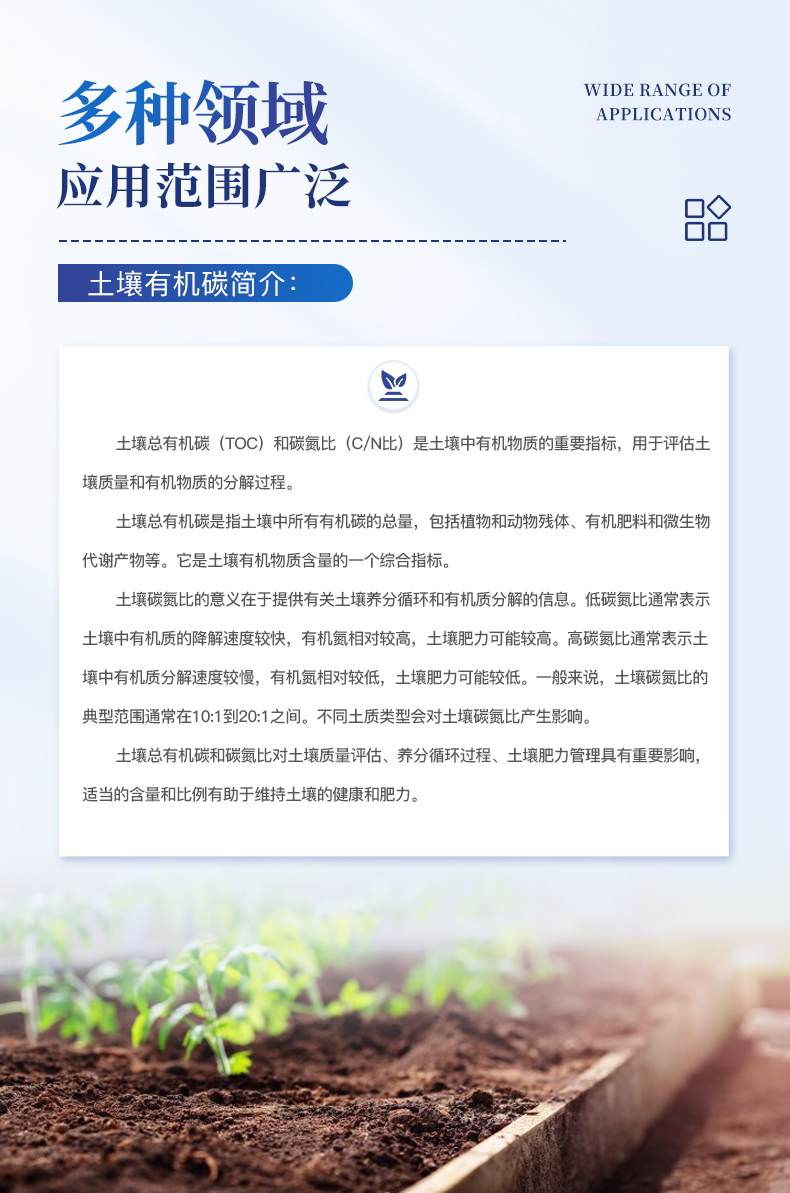 產品描述:產品簡介: 土壤和肥料的總有機碳和碳氮比是兩個不同的指標,用于描述土壤和肥料中有機物質的特性。 土壤的總有機碳和碳氮比: 土壤的總有機碳是指土壤中所有有機碳的總量,包括植物和動物殘體、微生物、有機肥料等。土壤的總有機碳含量是評估土【詳情】  更新時間:2026-04-07