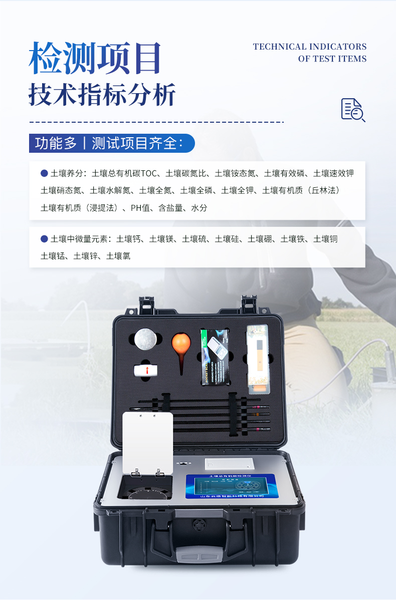 | 1、土壤養分: ●土壤總有機碳TOC、土壤碳氮比、銨態氮、土壤有效磷、土壤速效鉀、土壤硝態氮、土壤水解氮、土壤全氮、土壤全磷、土壤全鉀、土壤有機質(丘林法)、土壤有機質(浸提法)、PH值、含鹽量、水分。 ●土壤中微量元素:土壤鈣、土壤鎂、土壤硫、土壤硅、土壤硼、土壤鐵、土壤銅、土壤錳、土壤鋅、土壤氯; ●土壤重金屬:土壤鉛、土壤砷、土壤鎘、土壤鉻、土壤汞。 | 2、肥料養分: ●有機肥總有機碳TOC、有機肥碳氮比、全氮、有機肥全磷、有機肥全鉀、有機肥硝態氮、有機肥速效磷、有機肥速效鉀、有機肥酸解氮、有機質; ●復合肥碳氮比、全氮、復合肥全磷、復合肥全鉀; ●水溶肥碳氮比、全氮、水溶肥全磷、水溶肥全鉀; ●葉面肥碳氮比、全氮、葉面肥全磷、葉面肥全鉀; ●水溶性腐植酸(風化煤)、水溶性腐植酸(褐煤)、水溶性腐植酸(泥炭)、游離態腐植酸(風化煤)、游離態腐植酸(褐煤)、游離態腐植酸(泥炭); ●單質肥:氮肥中銨態氮、肥料硝態氮、尿素氮、縮二脲、磷肥中磷、磷肥中水溶性磷、鉀肥中鉀; ●各種肥料微量元素:肥料鈣、肥料鎂、肥料硫、肥料硅、肥料硼、肥料鐵、肥料銅、肥料錳、肥料鋅、肥料氯; ●肥料重金屬:肥料鉛、肥料砷、肥料鎘、肥料鉻、肥料汞。 |
