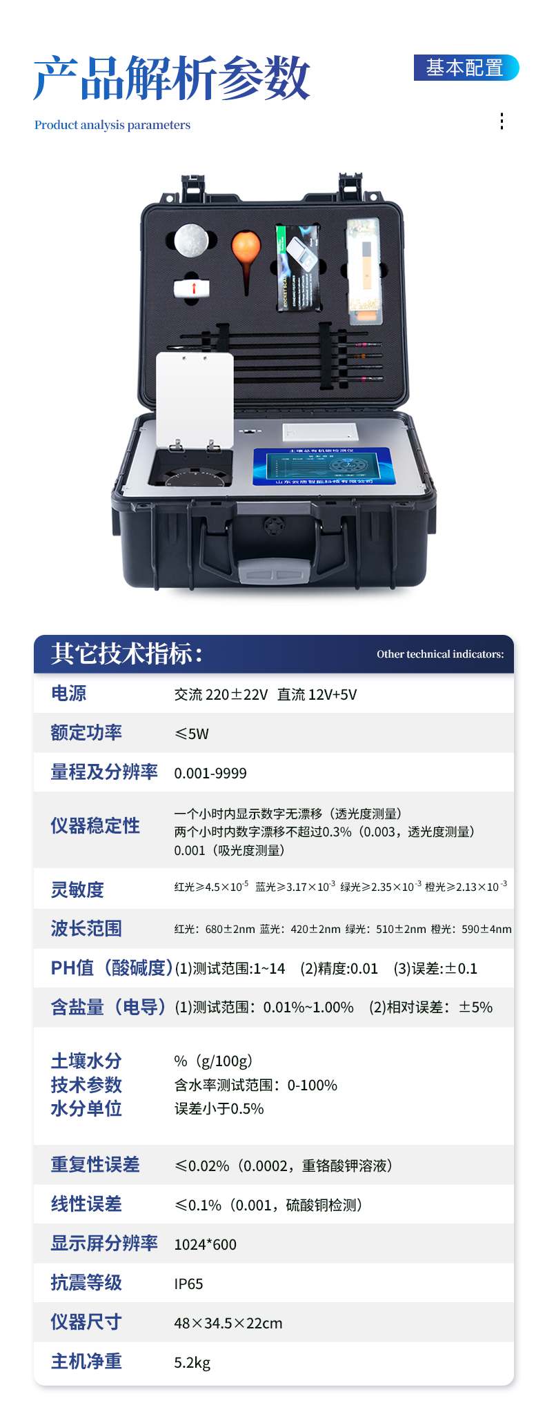 | 1.電源:交流 220±22V 直流 12V+5V(儀器內置鋰電池也可用車載電源) | 2.功率: ≤5W | 3.量程及分辨率:0.001-9999 | 4.重復性誤差: ≤0.02%(0.0002,重鉻酸鉀溶液) | 5.儀器穩定性:一個小時內顯示數字無漂移(透光度測量);兩個小時內數字漂移不超過0.3%(0.003,透光度測量)、0.001(吸光度測量)。 | 6.線性誤差: ≤0.1%(0.001,硫酸銅檢測) | 7.靈敏度:紅光≥4.5 ×10-5 藍光≥3.17×10-3 綠光≥2.35×10-3 橙光≥2.13×10-3 | 8.波長范圍 :紅光:680±2nm; 藍光:420±2nm; 綠光:510±2nm;橙光:590±4nm | 9.PH值(酸堿度): (1)測試范圍:1~14 (2)精度:0.01 (3)誤差:±0.1 | 10.含鹽量(電導):(1)測試范圍:0.01%~1.00% (2)相對誤差:±5% | 11.土壤水分技術參數水分單位:﹪(g/100g);含水率測試范圍:0-100﹪;誤差小于0.5% | 12.顯示屏分辨率:1024*600 | 13.抗震等級:IP65 | 14、儀器尺寸:48×34.5×22cm | 15、主機凈重:5.2kg |