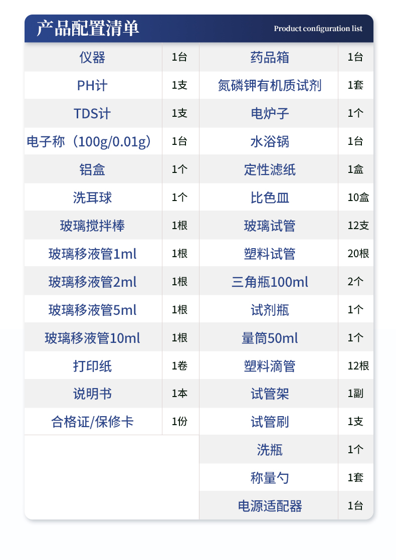 | 名稱 | 藥品箱 | 氮磷鉀有機質試劑 | 定性濾紙 | 比色皿 | 玻璃試管 | 塑料試管 | 三角瓶100ml | 試劑瓶 | 量筒50ml | 塑料滴管 | 試管架 | 試管刷 | 洗瓶 | 稱量勺 | 電源適配器 |