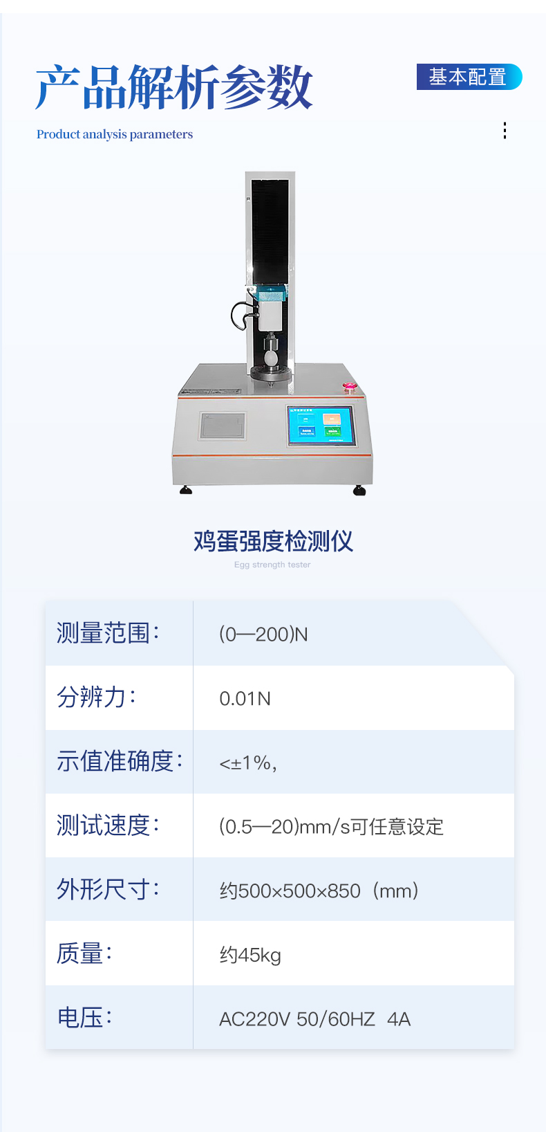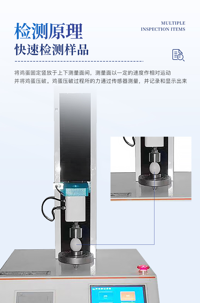 蛋殼強度測定儀(Eggshell Strength Tester)是衡量雞、鵝、鴨等禽蛋蛋殼質量的重要指標。雞蛋蛋殼的強度與種雞的種蛋入孵率、孵化率、雞苗質量以及商品蛋雞的鮮蛋產量密切相關。殼質堅實的蛋很少破損,能較久且完好地保存其營養價值,有良好的商品性。蛋殼質量下降,對許多養雞場造成的經濟損失相當嚴重。而雞蛋殼強度與種雞的品種、遺傳和食料密切相關。正確掌握蛋殼強度有關指標尤為重要。蛋殼強度測定儀操作簡單,測量快速,對蛋品質分析以及家畜育種提供直接數據,是大型養雞場,食品加工廠和科研院所檢測雞蛋品質指標的選擇。