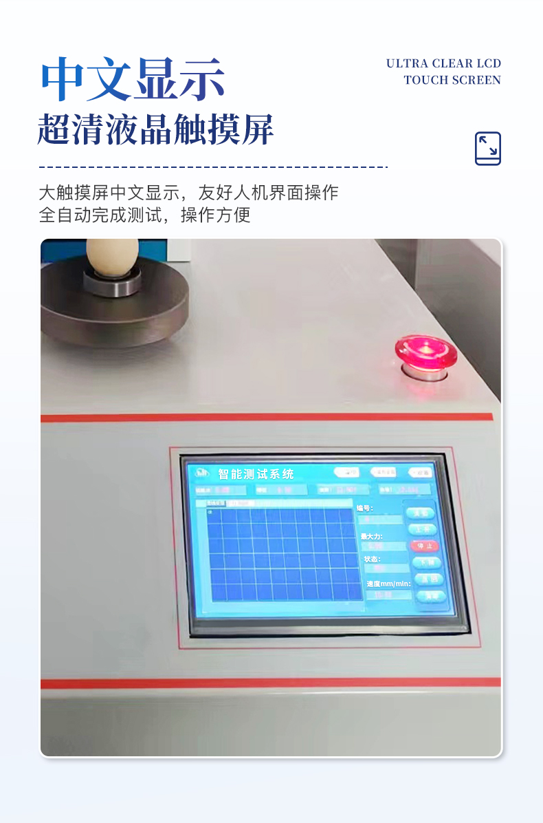 | 1、采用芯片控制,精度測力傳感器,精度高。 | 2、采用高性能電機,精密滾珠絲桿傳動,保證該儀器傳動。 | 3、大觸摸屏中文顯示,友好人機界面操作。全自動完成測試。操作方便,具有測試數據統計處理功能,微型打印機輸出。 | 4、隨機配備蛋殼豎立固定裝置,方便快速測量。 | 5、便攜式,重量輕,體積小,有提手,可以隨時現場使用. |