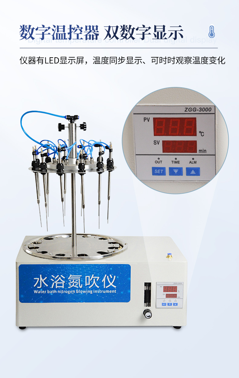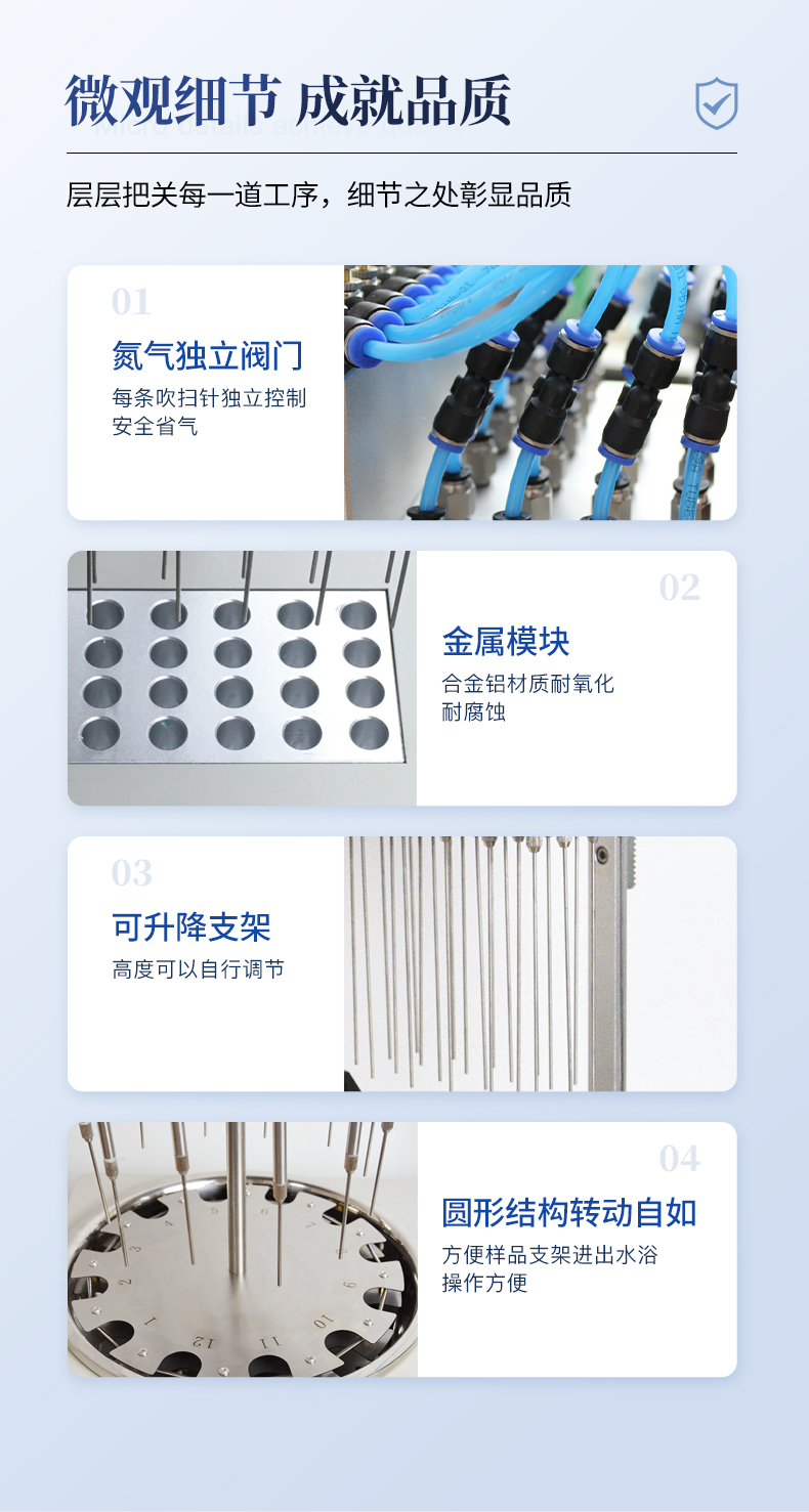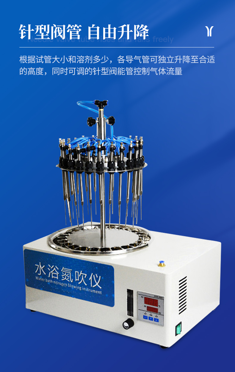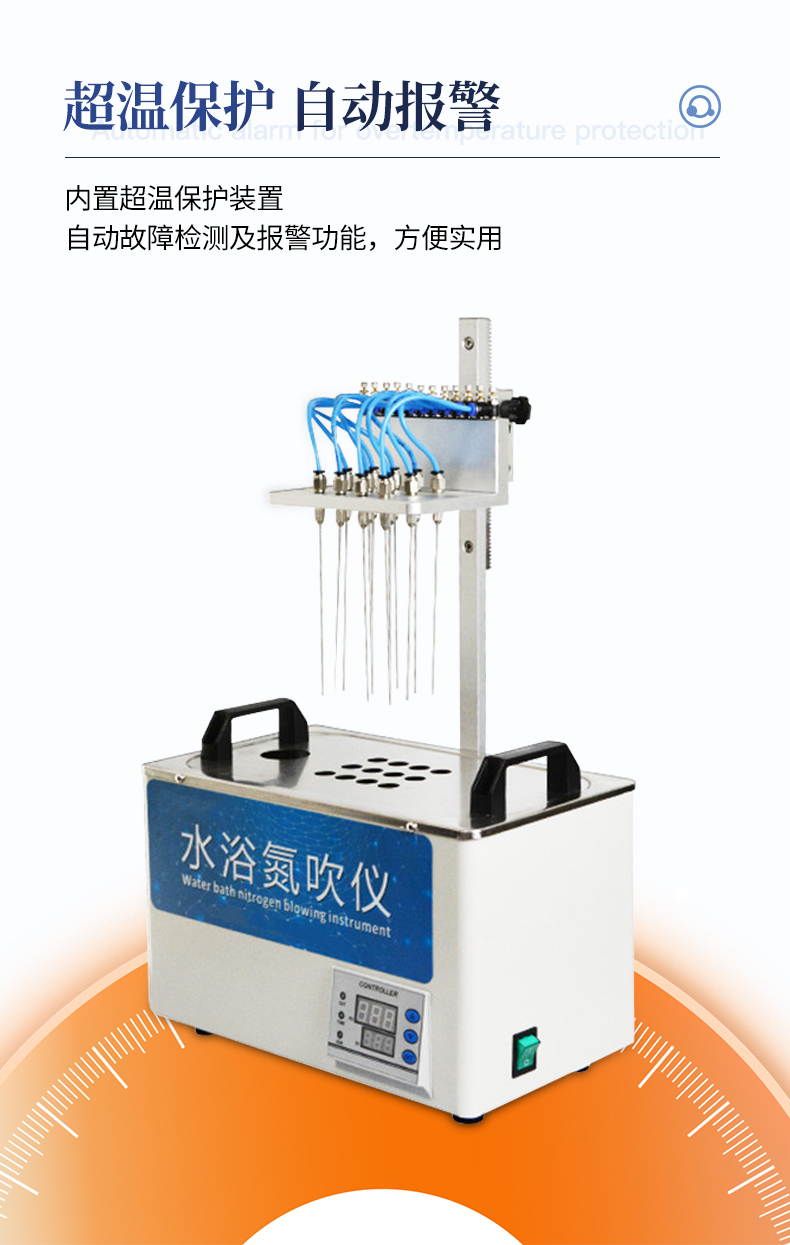 | 1、每個吹針都可以獨立控制,避免引起交叉污染。 | 2、儀器氣腔高度可以自行調節,配備標準氣針長度為15厘米。 | 3、氮吹儀有36個氣道控制開關,節約氣體,每根吹氣針的位置可獨立改變吹掃位置,使之適用不同的樣品容器及不同的樣品位置 | 4、在濃縮有毒溶劑時,整個系統可置于通風柜中,降低危險。 | 5、內置超溫保護裝置,自動故障檢測及報警功能,方便實用。 | 6、儀器有LED顯示屏,溫度同步顯示、時間遞減顯示,可時時觀察溫度變化。 | 7、具有整體溫度更均勻,加熱速度快 | 8、本產品還可以作為普通的干式恒溫器使用 | 9、使用起來更簡便,而且溫度也可以達到150℃,可以更好濃縮樣品 |