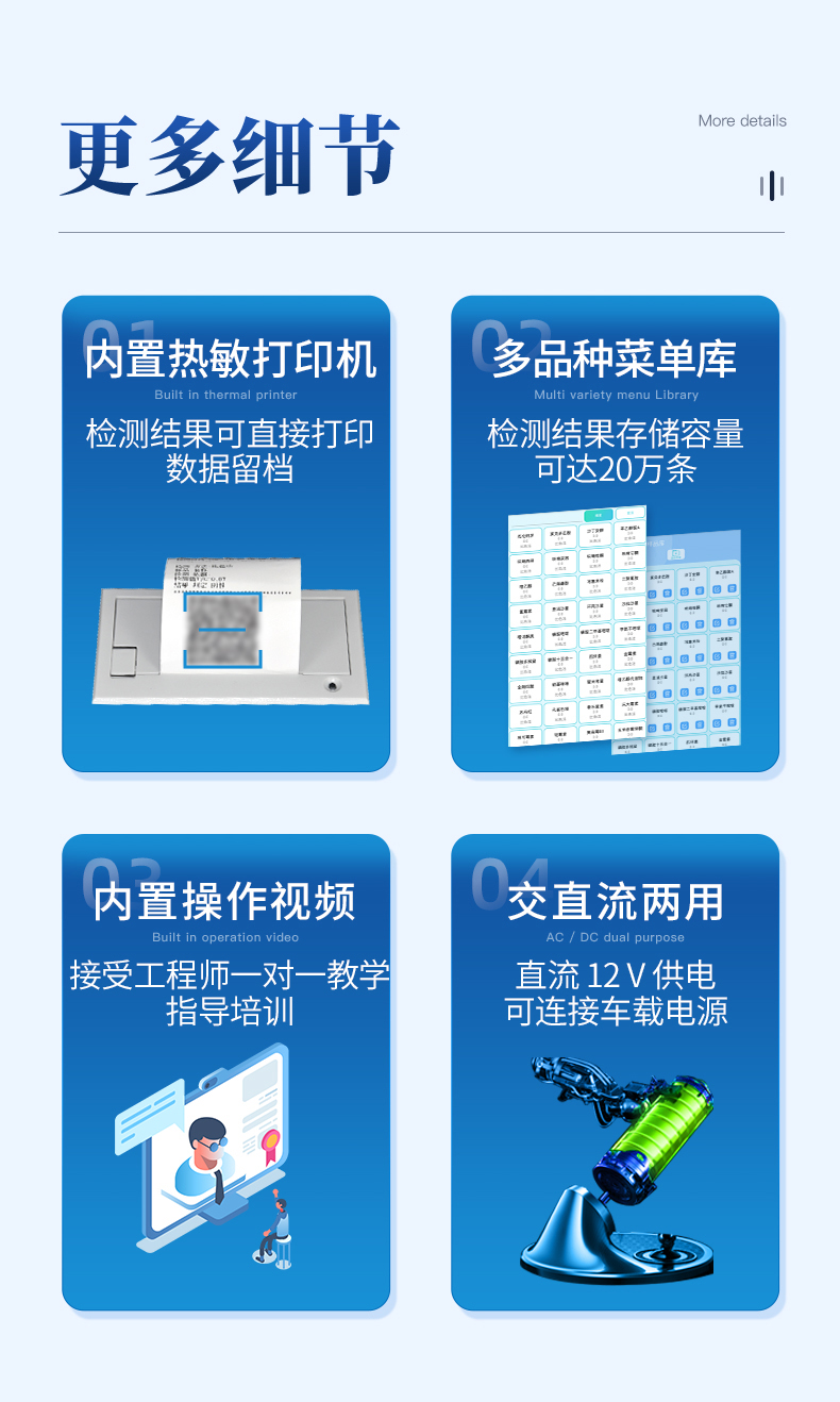 | 1、儀器采用10.1英寸液晶觸摸屏顯,搭配運行安卓智能操作系統,主控芯片采用ARM Cortex-A7,RK3288/4核處理器,主頻1.88Ghz,運轉速度更快速,性能更強。 | 2、儀器功能包括:膠體金檢測模塊、數字化管理模塊、無線通訊模塊等,可以滿足同一軟件下實現所有檢測項目的檢測,并在同一窗口展示檢測結果。 | 3.一體化便攜式快檢設備,采用交直流兩用供電方式,可連接車載電源,配備6ah大容量充電鋰電池,可以滿足現場及流動檢測使用的需求。儀器尺寸:43×35×20cm, 主機凈重:5.1kg | 4、系統自帶數據集成模塊,設備首頁自動統計檢測數據包含:周檢測數據、月檢測數據,全部檢測總數量,均包含檢測總數,合格數,不合格數,以及相關柱形分析圖,對各項檢測數據清晰掌握,無需電腦查詢,更加快捷直觀。 | 5、儀器具有任務預設模塊,可在樣品送檢前提前預設樣品名稱、檢測指標、送檢單位等信息,樣品送檢時一鍵調取保存信息,檢測更加方便快捷。 | 6、膠體金檢測模塊: | 軌道式自動傳輸掃描方式,可實時顯示金標卡實時圖像,系統自動分析并呈現出CT曲線圖,CT線自動識別,無需手動調整,完成檢測后自動退出檢測卡。 | 結果判定線可修改,對照值標定值可保存,斷電不丟失數據。 | 兼容市場上其他膠體金卡,使用耗材不受限制,極大增強用戶使用體驗。 | 7、儀器檢測系統擁有龐大數據庫,并且構建了完善的檢索、修訂功能。食品庫涵蓋多種樣品名稱,可按需添加或刪除、編輯樣品名稱;產品數據庫以及歷史檢測記錄支持一鍵檢索功能。 | 8、系統打印自定義化,打印格式多樣化,產品合格證(國家標準要求),二維碼,抽樣信息、檢測信息,受檢信息、復核信息、抽樣日期、檢測日期等信息結果,可按需求自行設置打印內容。 | 9、A4紙版本報告打印功能(可選配):設備擁有兩種結果展示方式,可以自動生成A4打印模板和小票打印模板兩種樣式,可通過WiFi及網線等方式鏈接外置打印機可進行打印 | 10、儀器具有 wifi 聯網上傳、RJ45網線連接功能,可以快速上傳數據。同步對接監管平臺,數據可局域網和互聯網數據上傳,檢測結果直接傳至食品安全監管平臺。進行區域食品安全監管及大數據分析處理與數據統計,檢測區域食品安全長短期動態,達到食品安全問題預估、預警。 | 11、設備支持U盤存儲,標準USB接口,免驅動安裝。檢測結果存儲容量20萬條以上,可生成Excel表格,進行一鍵拷貝,并具有登錄保護功能,可設置用戶名及密碼,規范不同人員操作權限,防止非工作人員操作,并且可以進行重新校準、鎖定、恢復出廠設置功能。儀器固件可升級,后期檢測項目可擴充。 | 12、儀器具備遠程升級功能,可定向分客戶分儀器更新,開機后自動更新,并可持續性免費更新系統版本,無需像傳統產品返廠更新,節省時間及人力成本并避免了物流運輸返廠升級導致設備損壞的潛在風險。 |