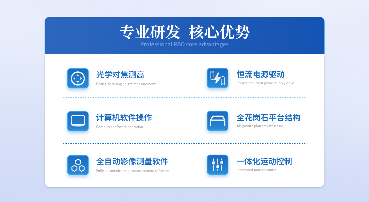 | 1. 采用HKVISION千兆網數字相機及手動卡位變焦物鏡作為測量瞄準系統; | 2. 由移動工作臺、三軸電子光柵尺和運動專用控制盒組成數據傳動控制系統; | 3. 采用雙重閉循環運動控制,保證電機在高速運動時**的定位性能; | 4. 采用本公司開發的嵌入式模塊控制機電,提高了電機回應速度,同時簡化儀器與PC的界面,; | 5. 采用全花崗石平臺結構,外觀簡潔大方,永不變形,永不生銹; | 6. 表面光由四環八區環形LED光源組成,每一組均為恒流電源驅動,并按需要分區程序顯示; | 7. Z軸影像對焦直接通過計算機軟件操作,無需手動調焦,大幅度提高工作效率; | 8. 具有多種數據處理、顯示、輸入、輸出功能,使測量與辦公完全結合在一起; | 9. 與計算機連接后,采用DTVCNC全自動影像測量儀專用軟件測繪圖形進行處理及輸出; |