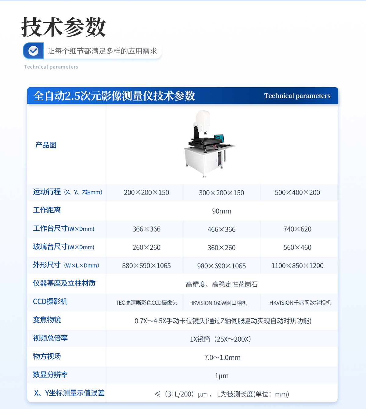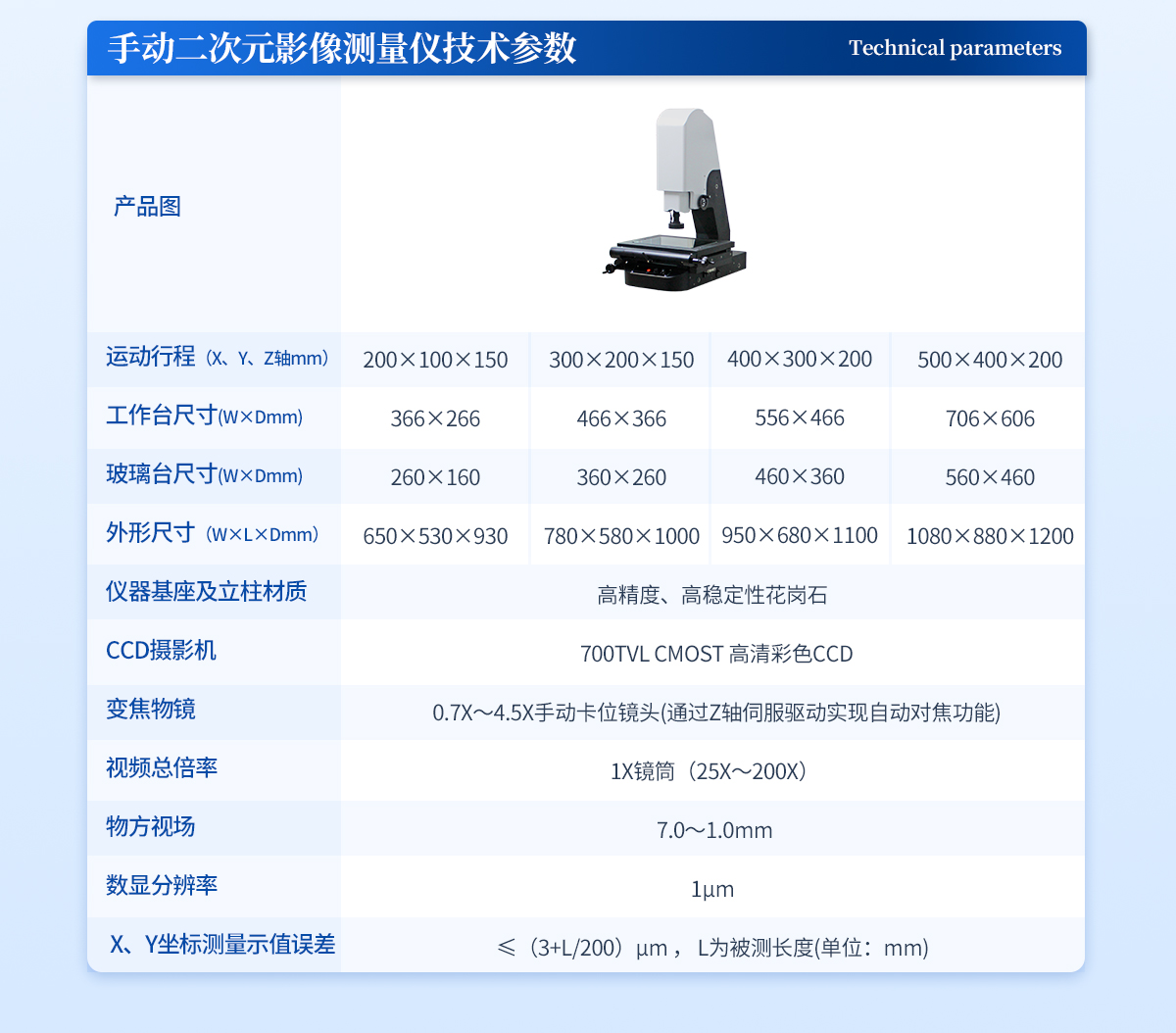 | 1. 運動行程(X、Y、Z軸mm):500×400×200 | 2. 工作距離:90mm | 3. 工作臺呎寸(W×Dmm):740×620 | 4. 玻璃臺呎寸(W×Dmm):560×460 | 5. 外形尺寸(W×L×Dmm):1100×850×1200 | 6. 儀器基座及立柱材質:高精度、高穩定性花崗石 | 7. CCD攝影機:HKVISION 160W網口相機 | 8. 變焦物鏡: 0.7X~4.5X手動卡位鏡頭(通過Z軸伺服驅動實現自動對焦功能) | 9. 視頻總倍率: 1X鏡筒(25X~200X) | 10. 物方視場: 7.0~1.0mm | 11. 數顯分辨率:1μm | 12. X、Y坐標測量示值誤差≤(3+L/200)μm , L為被測長度(單位:mm) | 13. 操作方式:XYZ三軸全自動伺服電機控制 +集成一體化運動控制設計 (只需對接220V電源界面、USB界面、AV視頻界面即可使用) | 14. 測量軟件:INS全自動影像儀專用測量軟件 | 15. 工作環境:溫度20±5 ℃,濕度35%-75%(盡量滿足環境條件),如果溫濕度條件不能達到以上標準,至少要將儀器放置在少灰塵,少油氣,遠離振動源的室內。 |
