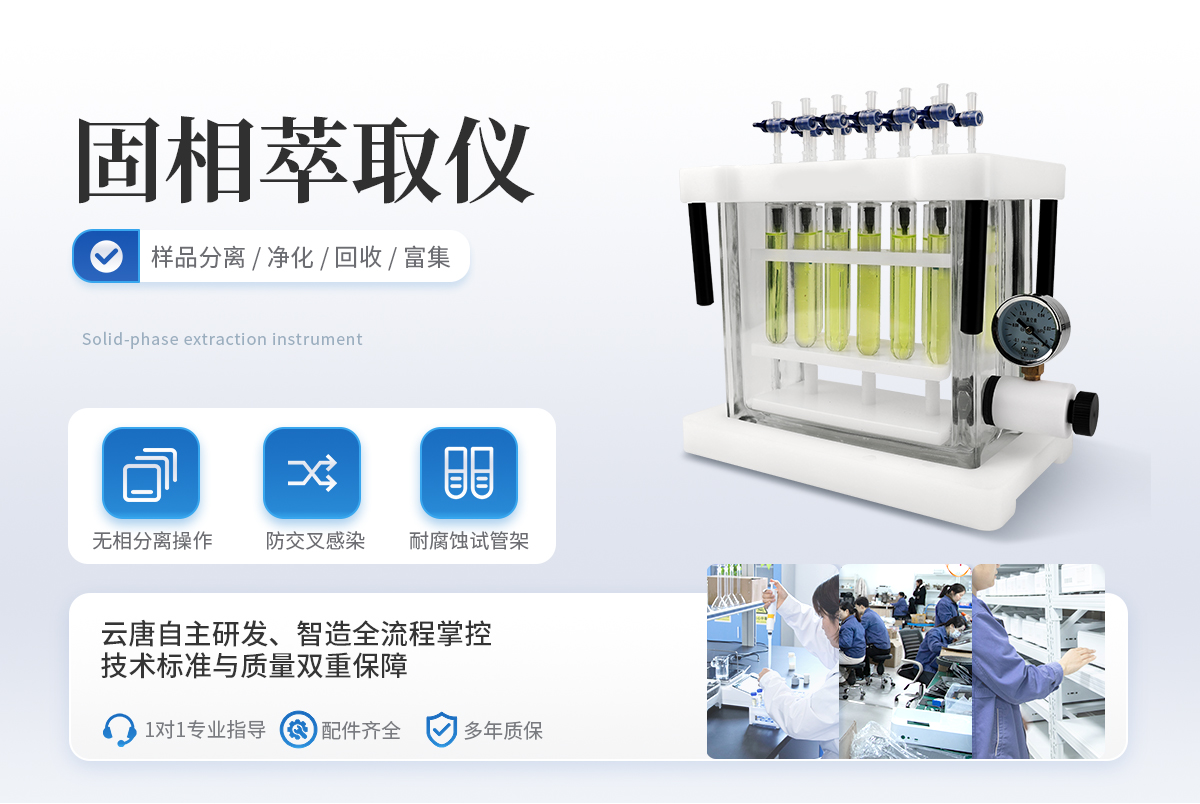 固相萃取儀是由液固萃取和液相色譜技術相結合發展而來,利用固體吸附劑將液體樣品中的目標化合物吸附,與樣品的基體和干擾化合物分離,然后再用洗脫液洗脫或加熱解吸附,達到分離和富集目標化合物的目的(即樣品的分離,凈化和富集),目的在于降低樣品基質干擾,提高檢測靈敏度,其應用于各類食品安全檢測、農產品殘留監控、醫藥衛生、環境保護、商品檢驗、自來水及化工生產實驗室。