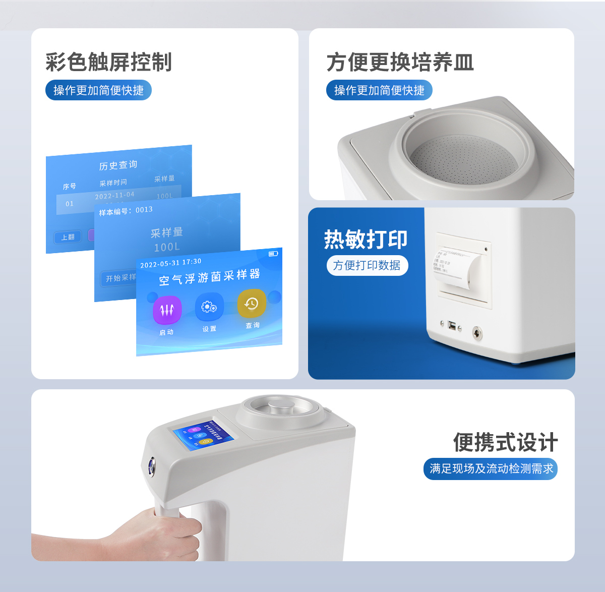 | ●新型手持式外觀,美觀大方,使用方便。 | ●彩色觸屏控制,操作更加**快捷。 | ●LCD顯示采樣量,采樣時間等參數。 | ●可將采樣量,采樣時間等參數按組儲存。 | ●更換培養(yǎng)皿簡便,拿下采樣口即可更換培養(yǎng)皿。 | ●帶熱敏打印機,方便打印數據。 | ●帶上位機軟件,數據可導出電腦,方便歷史分析。 | ●交直流兩用,內置6000mAh大容量鋰電池,可連續(xù)采樣8小時。 | ●程序支持中文或英文。 |