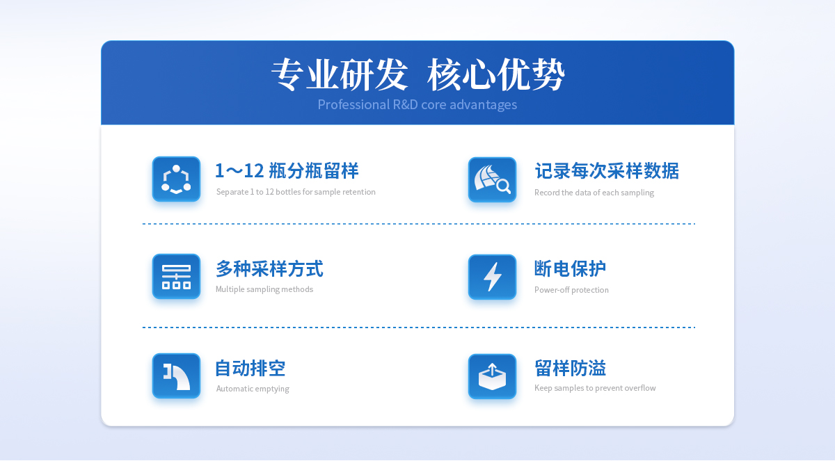 | 1、分瓶留樣功能:儀器可實現 1~12 瓶分瓶留樣,瓶數可自由設定; | 2、采樣功能:可實現定時采樣、時間等比、流量等比、外控采樣、串口控制等多種采樣方式; | 3、記錄功能:可記錄每次采樣的留樣瓶號、留樣時間、留樣量、COD 值和 NH3-N 值,可記錄*新 1000 條數據記錄; | 4、對外接口:流量計模擬接口,RS485 接口; | 5、斷電保護功能:儀器在運行狀態下斷電并重新通電后,儀器能自動恢復原 運行狀態,斷電后儀器參數不丟失; | 6、自動排空功能:每次采樣完畢,系統可自動排空管內存水,以保證采樣管 路不產生沉積堵塞; | 7、防溢功能:用戶可設置留樣瓶數量,完成設定瓶數的留樣后停止留樣; | 8、水樣冷藏功能:采用**制冷裝置,可使留存的水樣保存在 0℃~4℃環境; |