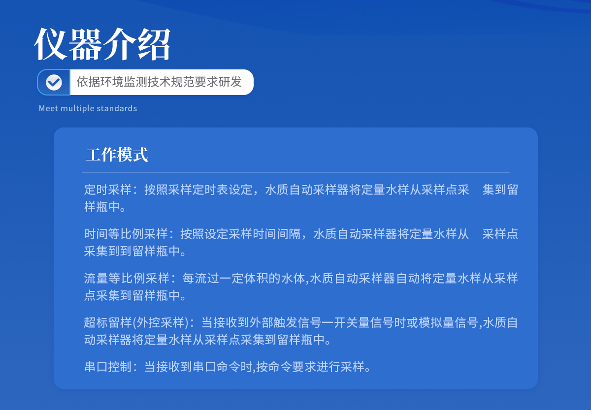 | 1.定時采樣:按照采樣定時表設定,水質自動采樣器將定量水樣從采樣點采 集到留樣瓶中。 | 2.時間等比例采樣:按照設定采樣時間間隔,水質自動采樣器將定量水樣從 采樣點采集到到留樣瓶中。 | 3.流量等比例采樣:每流過一定體積的水體,水質自動采樣器自動將定量水樣從采樣點采集到留樣瓶中。 | 4.超標留樣(外控采樣):當接收到外部觸發信號一開關量信號時或模擬量信號,水質自動采樣器將定量水樣從采樣點采集到留樣瓶中。 | 5.串口控制:當接收到串口命令時,按命令要求進行采樣。 |