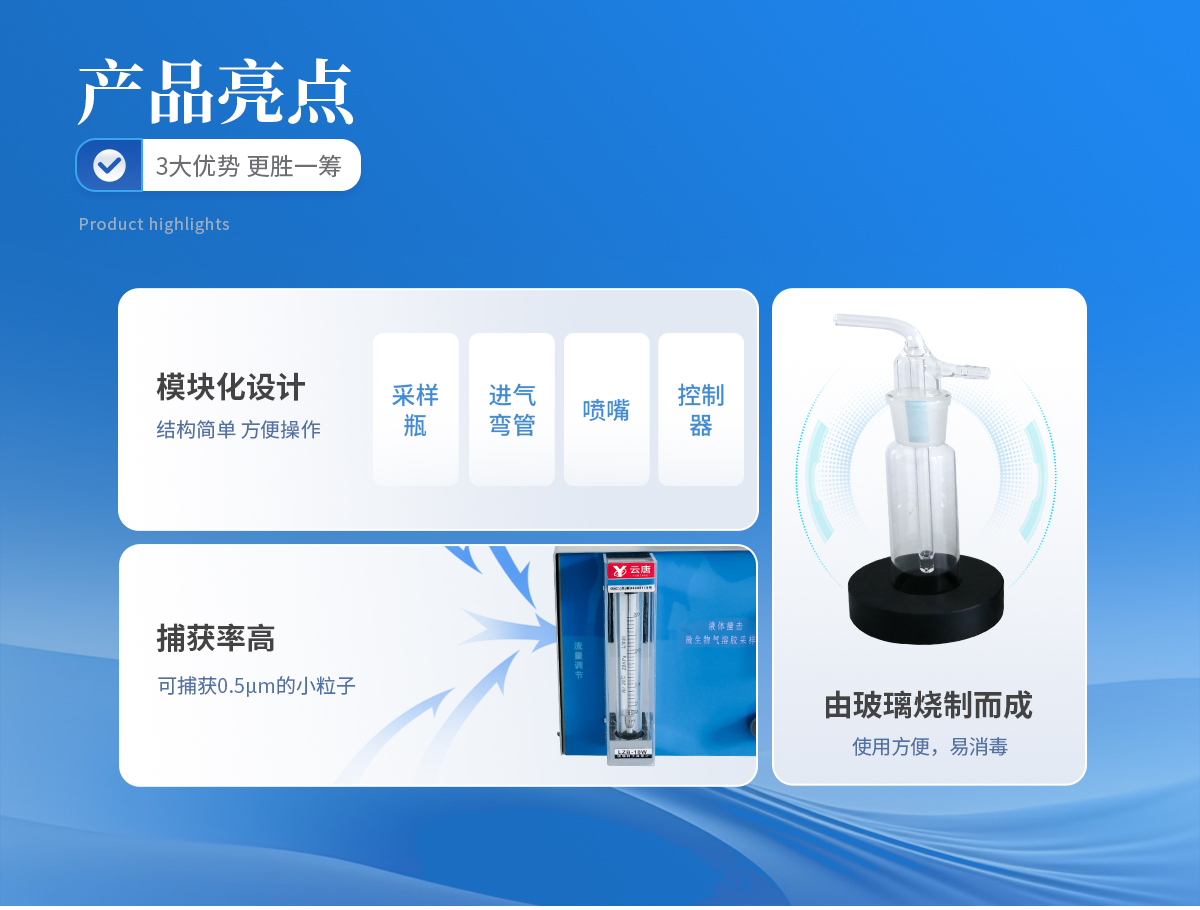 液體沖擊式微生物氣溶膠采樣器 (又稱:液體撞擊式采樣器)是全玻璃制造,由采樣瓶、進(jìn)氣彎管、噴嘴、控制器組成結(jié)構(gòu)是有一呈90度弧型彎曲的進(jìn)氣管和一盛采樣液體的外瓶。進(jìn)氣管上部的彎管,是模擬人的上呼吸道對氣溶膠粒子的阻攔。在管的末端有一微孔噴嘴, 氣流經(jīng)此速度變快可達(dá)聲速,利用噴射氣流將空氣中的微生物粒子采集于液體采樣介質(zhì)中。由于液體的粘附性,將微生物粒子捕獲。