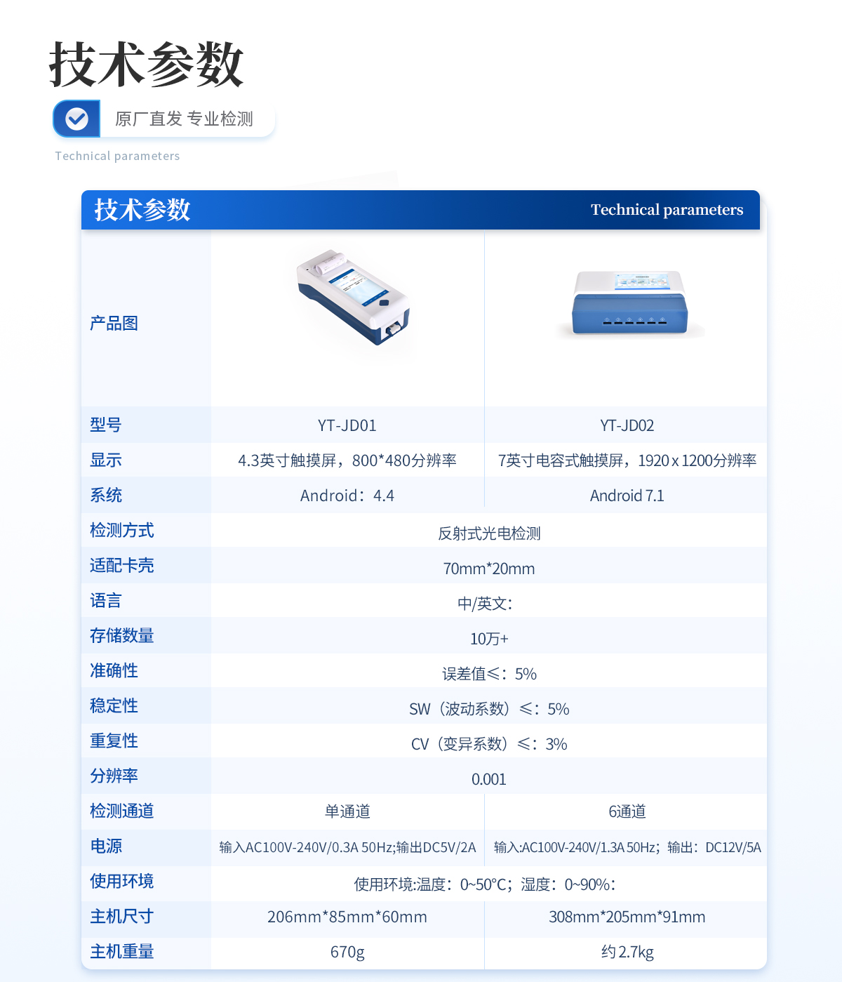 | 1、★ 10.1英寸電容式觸摸屏,分辨率:1280:x:800,內(nèi)部存儲:1+8GB | 2、 操作系統(tǒng):Android:7.1 | 3、 ★檢測方式:反射式光電 | 4、 語言:中/英文: | 5、 存儲數(shù)量:10萬+ | 6、 準(zhǔn)確性:誤差值≤:5% | 7、 穩(wěn)定性:SW(波動系數(shù))≤5% | 8、 重復(fù)性:CV(變異系數(shù))≤3% | 9、 分辨率:0.001 | 10、 ★通道:1個單卡卡槽(70mm*20mm*5.6mm);1個二聯(lián)卡卡槽(70mm*28mm*5.6mm);1個三聯(lián)卡卡槽(70mm*40mm*5.6mm);1個四聯(lián)卡卡槽(70mm*50mm*5.6mm) | 11、 檢測時間:<:5秒:(單卡及多聯(lián)卡);可對樣本進(jìn)行檢測。<> | 12、 打印機(jī):熱敏打印機(jī)(熱敏打印紙:57*30mm) | 13、 ★數(shù)據(jù)傳輸:WiFi、藍(lán)牙、USB、射頻讀卡、外置掃碼模塊(選配) | 14、 ★數(shù)據(jù)處理:可通過通訊端口進(jìn)行數(shù)據(jù)匯總、上傳監(jiān)管平臺等 | 15、 ★檢測通道孵育檢測一體,溫度范圍::室溫:+5℃:~:60℃ | 16、 ★接口:USB接口:2個;USB-B接口:1個;LAN接口:1個:;DC電源接口:5.5/2.1mm | 17、 電源:輸入:AC:220V:±:20V,:50Hz:±:1Hz;輸出:DC:12V,:5A | 18、 使用環(huán)境:溫度:0~50℃;濕度:0~90%: | 19、 主機(jī)尺寸::382mm:x:300mm:x:117mm | 20、 主機(jī)重量:約:3.6kg |