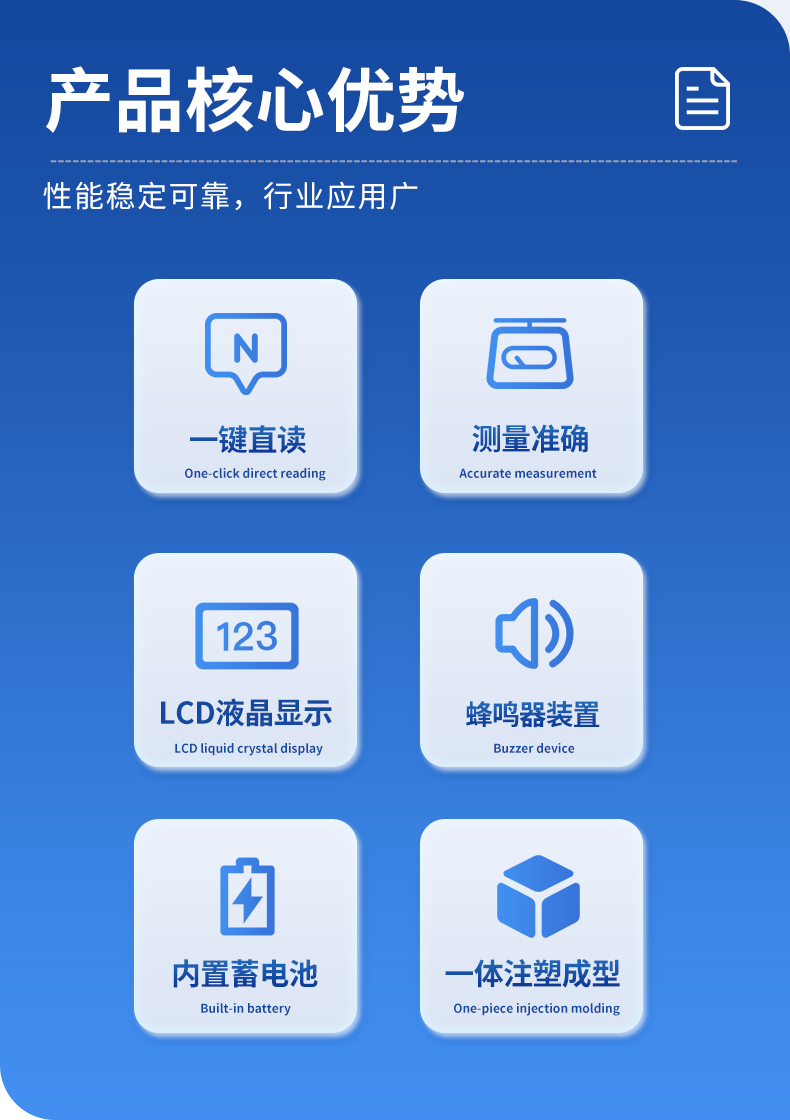 | 測試種類 化工溶液、化工助劑、現代能源、石油燃燒、藥劑、油漆涂料、瀝青、食用油等各種液體 | 測試時間 約5秒 | 顯示值 密度、體積 | 溫度補償 溶液溫度可設定至0~100℃ | 溶液補償 溶液可設定至19.999 |