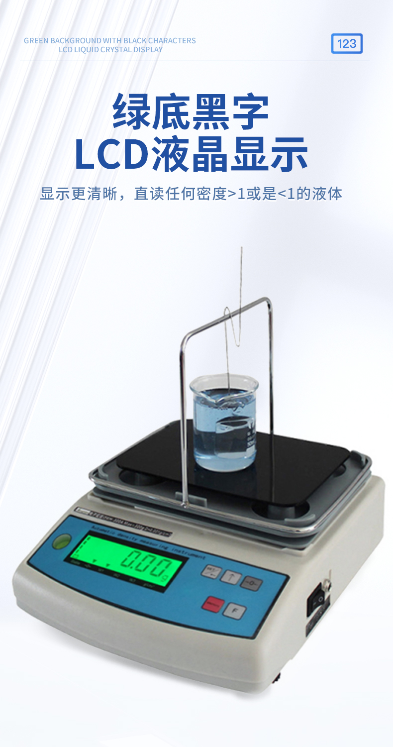 | 1.直讀任何密度>1或是<1的液體.> | 2.具有溫度補償設定、溶液補償設定功能,更人性化的操作、更符合現場作業需求 | 3.密度測量臺一體注塑成型,安裝方便快速,使用時間更長. | 4.采用不銹鋼T型架具有極強的耐腐蝕性,專用砝碼掛鉤極大地降低了吊欄線浮力所造成的誤差 | 5.具有密度上、下限功能,可判定待測物的比重合格與否。設有蜂鳴器裝置 | 6.內置蓄電池,選配防風罩,更適合現場測試 | 7. 綠底黑字LCD液晶顯示,顯示更清晰 |