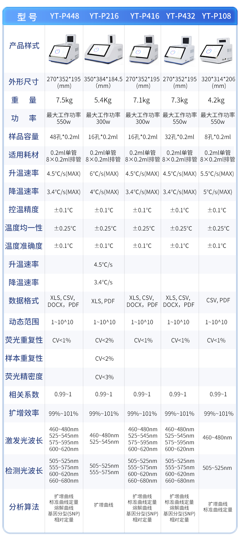 | 基本性能 | 外形尺寸:270*352*195 (mm) | 重量:7.1kg | 電源:220V | 功率:**工作功率300w | 操作系統:自帶Android操作系統 | 外接電腦:外接windows電腦(win7系統以上) | 系統語言:中英文實時切換 | 通信接口:方形USB | 操作環境參數 | 操作環境溫度:18~35℃ | 操作環境相對濕度:0%~85% | 運輸及儲存溫度:-20~55℃ | 運輸及儲存相對濕度:0%~85% | 系統性能 | 樣品容量:16孔*0.2ml | 樣品容積:15~100ul | 適用耗材:0.2ml單管、8×0.2ml排管 | 控溫范圍:4~99℃ | 熱蓋溫度:30℃-108℃(默認105℃,熱蓋溫度可調) | 溫控方式:高性能進口半導體 | 梯度控溫:3模塊梯度控溫,**溫差支持35℃ | 升溫速率:4.5℃/s(MAX) | 降溫速率:3.4℃/s(MAX) | 控溫精度:±0.1℃ | 溫度均一性 :±0.25℃ | 溫度準確度 :±0.1℃ | 操作功能:預設項目和分析參數,操作簡單方便 | 報告:支持報告自定義模塊,16孔分項目打印 | 分析功能:具多重qPCR數據分析功能,可同時檢測4個檢測通道 | 斷電保護:可以一鍵重啟中斷的實驗 | 儀器信息:擁有故障記錄,分析,提示的功能,更方便遠程解決問題 | 分析算法:擴增曲線,標準曲線定量、熔解曲線,基因分型(SNP),相對定量 | 支持HRM檢測:支持 | 數據導出:可將實驗結果以圖形和表格的形式直接導出;詳細的數據報告內容包括實驗條件,數據坐標和表格,數據分析參數。 | 數據格式:XLS, CSV, DOCX,PDF | TouchDown功能:支持時間和溫度遞增遞減模式 | 熒光檢測系統性能 | 檢測靈敏度:可檢測單拷貝基因 | 動態范圍:1~10^10 | 熒光重復性: CV<1%(使用某品牌試劑做16孔均一性實驗,16個孔的ct差值保持在0.5以內,cv保持在1%以內。)<> | 相關系數:0.99~1(每種濃度3個重復,梯度曲線的相關系數>0.99,擴增效率保持在99%~101%之間) | 擴增效率:99%~101% | 可信度:區分1000與2000拷貝濃度差異 | 激光光源:大功率LED(免維護,壽命長) | 檢測器:高靈敏度光電傳感器 | 激發和檢測傳播介質:耐高溫專業導光光纖 | 激發光波長: 460nm~480nm , 525nm~545nm, 575nm~595nm ,600nm~620nm | 檢測光波長: 505nm~525nm , 555nm~575nm , 600nm~620nm , 660nm~680nm |