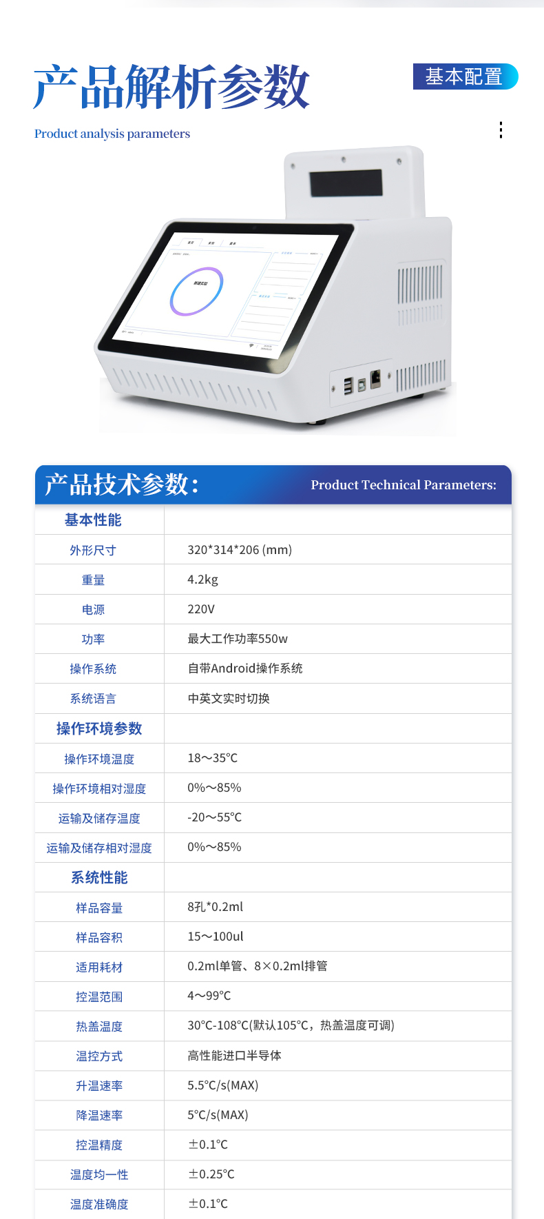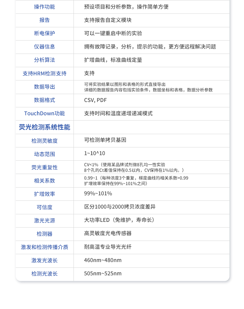 | 基本性能 | 外形尺寸:320*314*206 (mm) | 重量:4.2kg | 電源:220V | 功率:**工作功率550w | 操作系統:自帶Android操作系統 | 系統語言:中英文實時切換 | 操作環境參數 | 操作環境溫度:18~35℃ | 操作環境相對濕度:0%~85% | 運輸及儲存溫度:-20~55℃ | 運輸及儲存相對濕度:0%~85% | 系統性能 | 樣品容量:8孔*0.2ml | 樣品容積:15~100ul | 適用耗材:0.2ml單管、8×0.2ml排管 | 控溫范圍:4~99℃ | 熱蓋溫度:30℃-108℃(默認105℃,熱蓋溫度可調) | 溫控方式:高性能進口半導體 | 升溫速率:5.5℃/s(MAX) | 降溫速率:5℃/s(MAX) | 控溫精度:±0.1℃ | 溫度均一性 :±0.25℃ | 溫度準確度 :±0.1℃ | 操作功能:預設項目和分析參數,操作簡單方便 | 報告:支持報告自定義模塊 | 斷電保護:可以一鍵重啟中斷的實驗 | 儀器信息:擁有故障記錄,分析,提示的功能,更方便遠程解決問題 | 分析算法:擴增曲線,標準曲線定量 | 支持HRM檢測:支持 | 數據導出:可將實驗結果以圖形和表格的形式直接導出;詳細的數據報告內容包括實驗條件,數據坐標和表格,數據分析參數。 | 數據格式:CSV, PDF | TouchDown功能:支持時間和溫度遞增遞減模式 | 熒光檢測系統性能 | 檢測靈敏度:可檢測單拷貝基因 | 動態范圍:1~10^10 | 熒光重復性: CV<1%(使用某品牌試劑做8孔均一性實驗,8個孔的ct差值保持在0.5以內,cv保持在1%以內。)<> | 相關系數:0.99~1(每種濃度3個重復,梯度曲線的相關系數>0.99,擴增效率保持在99%~101%之間) | 擴增效率:99%~101% | 可信度:區分1000與2000拷貝濃度差異 | 激光光源:大功率LED(免維護,壽命長) | 檢測器:高靈敏度光電傳感器 | 激發和檢測傳播介質:耐高溫專業導光光纖 | 激發光波長 :460nm~480nm | 檢測光波長: 505nm~525nm |