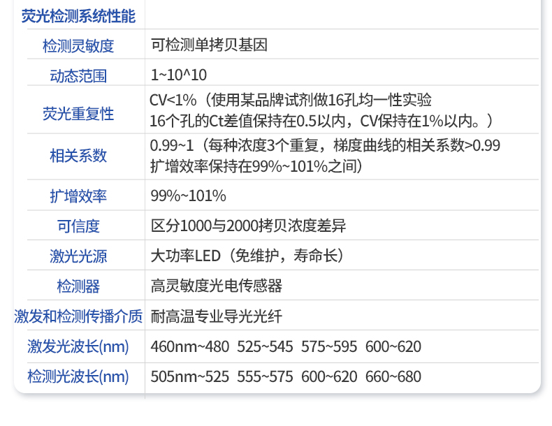 | 基本性能 | 外形尺寸:270*352*195 (mm) | 重量:7.1kg | 電源:220V | 功率:**工作功率300w | 操作系統(tǒng):自帶Android操作系統(tǒng) | 外接電腦:外接windows電腦(win7系統(tǒng)以上) | 系統(tǒng)語言:中英文實(shí)時(shí)切換 | 通信接口:方形USB | 操作環(huán)境參數(shù) | 操作環(huán)境溫度:18~35℃ | 操作環(huán)境相對濕度:0%~85% | 運(yùn)輸及儲存溫度:-20~55℃ | 運(yùn)輸及儲存相對濕度:0%~85% | 系統(tǒng)性能 | 樣品容量:16孔*0.2ml | 樣品容積:15~100ul | 適用耗材:0.2ml單管、8×0.2ml排管 | 控溫范圍:4~99℃ | 熱蓋溫度:30℃-108℃(默認(rèn)105℃,熱蓋溫度可調(diào)) | 溫控方式:高性能進(jìn)口半導(dǎo)體 | 梯度控溫:3模塊梯度控溫,**溫差支持35℃ | 升溫速率:4.5℃/s(MAX) | 降溫速率:3.4℃/s(MAX) | 控溫精度:±0.1℃ | 溫度均一性:±0.25℃ | 溫度準(zhǔn)確度:±0.1℃ | 操作功能:預(yù)設(shè)項(xiàng)目和分析參數(shù),操作簡單方便 | 報(bào)告:支持報(bào)告自定義模塊,16孔分項(xiàng)目打印 | 分析功能:具多重qPCR數(shù)據(jù)分析功能,可同時(shí)檢測4個(gè)檢測通道 | 斷電保護(hù):可以一鍵重啟中斷的實(shí)驗(yàn) | 儀器信息:擁有故障記錄,分析,提示的功能,更方便遠(yuǎn)程解決問題 | 分析算法:擴(kuò)增曲線,標(biāo)準(zhǔn)曲線定量、熔解曲線,基因分型(SNP),相對定量 | 支持HRM檢測:支持 | 數(shù)據(jù)導(dǎo)出:可將實(shí)驗(yàn)結(jié)果以圖形和表格的形式直接導(dǎo)出;詳細(xì)的數(shù)據(jù)報(bào)告內(nèi)容包括實(shí)驗(yàn)條件,數(shù)據(jù)坐標(biāo)和表格,數(shù)據(jù)分析參數(shù)。 | 數(shù)據(jù)格式:XLS, CSV, DOCX,PDF | TouchDown功能:支持時(shí)間和溫度遞增遞減模式 | 熒光檢測系統(tǒng)性能 | 檢測靈敏度:可檢測單拷貝基因 | 動(dòng)態(tài)范圍:1~10^10 | 熒光重復(fù)性:CV<1%(使用某品牌試劑做16孔均一性實(shí)驗(yàn),16個(gè)孔的Ct差值保持在0.5以內(nèi),CV保持在1%以內(nèi)。) | 相關(guān)系數(shù):0.99~1(每種濃度3個(gè)重復(fù),梯度曲線的相關(guān)系數(shù)>0.99,擴(kuò)增效率保持在99%~101%之間) | 擴(kuò)增效率:99%~101% | 可信度:區(qū)分1000與2000拷貝濃度差異 | 激光光源:大功率LED(免維護(hù),壽命長) | 檢測器:高靈敏度光電傳感器 | 激發(fā)和檢測傳播介質(zhì):耐高溫專業(yè)導(dǎo)光光纖 | 激發(fā)光波長:460nm~480nm , 525nm~545nm, 575nm~595nm ,600nm~620nm | 檢測光波長:505nm~525nm , 555nm~575nm , 600nm~620nm , 660nm~680nm |