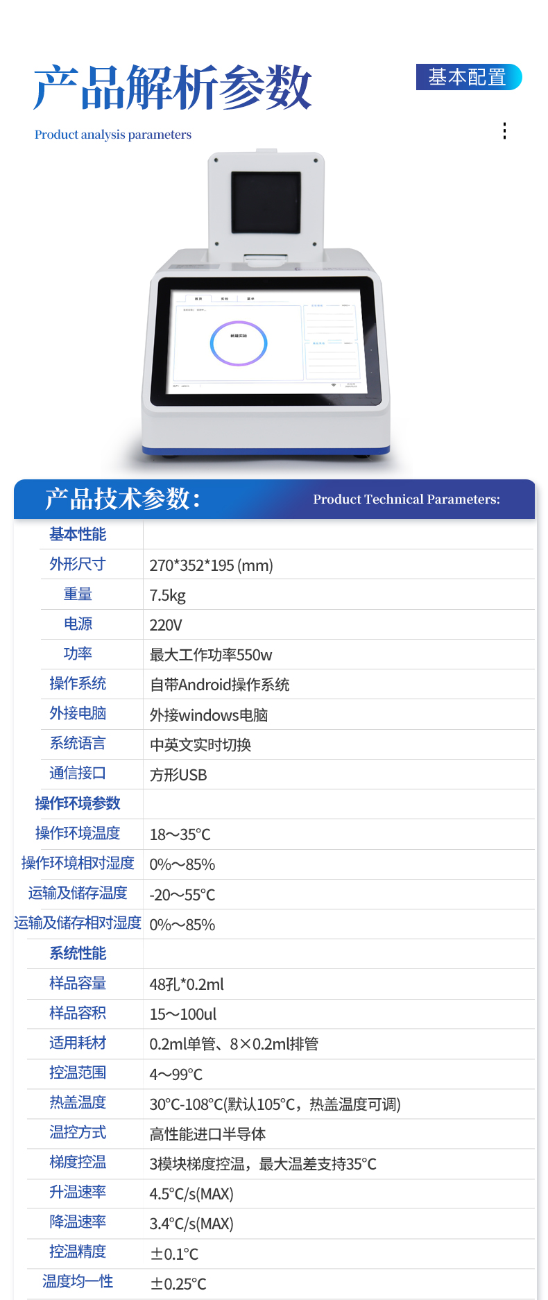 | 基本性能 | 外形尺寸:270*352*195 (mm) | 重量:7.5kg | 電源:220V | 功率:**工作功率550w | 操作系統(tǒng):自帶Android操作系統(tǒng) | 外接電腦:外接windows電腦(win7系統(tǒng)以上) | 系統(tǒng)語言:中英文實(shí)時(shí)切換 | 通信接口:方形USB | 操作環(huán)境參數(shù) | 操作環(huán)境溫度:18~35℃ | 操作環(huán)境相對(duì)濕度:0%~85% | 運(yùn)輸及儲(chǔ)存溫度:-20~55℃ | 運(yùn)輸及儲(chǔ)存相對(duì)濕度:0%~85% | 系統(tǒng)性能 | 樣品容量:48孔*0.2ml | 樣品容積:15~100ul | 適用耗材:0.2ml單管、8×0.2ml排管 | 控溫范圍:4~99℃ | 熱蓋溫度:30℃-108℃(默認(rèn)105℃,熱蓋溫度可調(diào)) | 溫控方式:高性能進(jìn)口半導(dǎo)體 | 梯度控溫:3模塊梯度控溫,**溫差支持35℃ | 升溫速率:4.5℃/s(MAX) | 降溫速率:3.4℃/s(MAX) | 控溫精度:±0.1℃ | 溫度均一性:±0.25℃ | 溫度準(zhǔn)確度:±0.1℃ | 操作功能:預(yù)設(shè)項(xiàng)目和分析參數(shù),操作簡單方便 | 報(bào)告:支持報(bào)告自定義模塊,48孔分項(xiàng)目打印 | 分析功能:具多重qPCR數(shù)據(jù)分析功能,可同時(shí)檢測(cè)4個(gè)檢測(cè)通道 | 斷電保護(hù):可以一鍵重啟中斷的實(shí)驗(yàn) | 儀器信息:擁有故障記錄,分析,提示的功能,更方便遠(yuǎn)程解決問題 | 分析算法:擴(kuò)增曲線,標(biāo)準(zhǔn)曲線定量、熔解曲線,基因分型(SNP),相對(duì)定量 | 支持HRM檢測(cè):支持 | 數(shù)據(jù)導(dǎo)出:可將實(shí)驗(yàn)結(jié)果以圖形和表格的形式直接導(dǎo)出;詳細(xì)的數(shù)據(jù)報(bào)告內(nèi)容包括實(shí)驗(yàn)條件,數(shù)據(jù)坐標(biāo)和表格,數(shù)據(jù)分析參數(shù)。 | 數(shù)據(jù)格式:XLS, CSV, DOCX,PDF | TouchDown功能:支持時(shí)間和溫度遞增遞減模式 | 熒光檢測(cè)系統(tǒng)性能 | 檢測(cè)靈敏度:可檢測(cè)單拷貝基因 | 動(dòng)態(tài)范圍:1~10^10 | 熒光重復(fù)性:CV<1%(使用某品牌試劑做48孔均一性實(shí)驗(yàn),48個(gè)孔的Ct差值保持在0.5以內(nèi),CV保持在1%以內(nèi)。) | 相關(guān)系數(shù):0.99~1(每種濃度3個(gè)重復(fù),梯度曲線的相關(guān)系數(shù)>0.99,擴(kuò)增效率保持在99%~101%之間) | 擴(kuò)增效率:99%~101% | 可信度:區(qū)分1000與2000拷貝濃度差異 | 激光光源:大功率LED(免維護(hù),壽命長) | 檢測(cè)器:高靈敏度光電傳感器 | 激發(fā)和檢測(cè)傳播介質(zhì):耐高溫專業(yè)導(dǎo)光光纖 | 激發(fā)光波長:460nm~480nm , 525nm~545nm, 575nm~595nm ,600nm~620nm | 檢測(cè)光波長:505nm~525nm , 555nm~575nm , 600nm~620nm , 660nm~680nm |