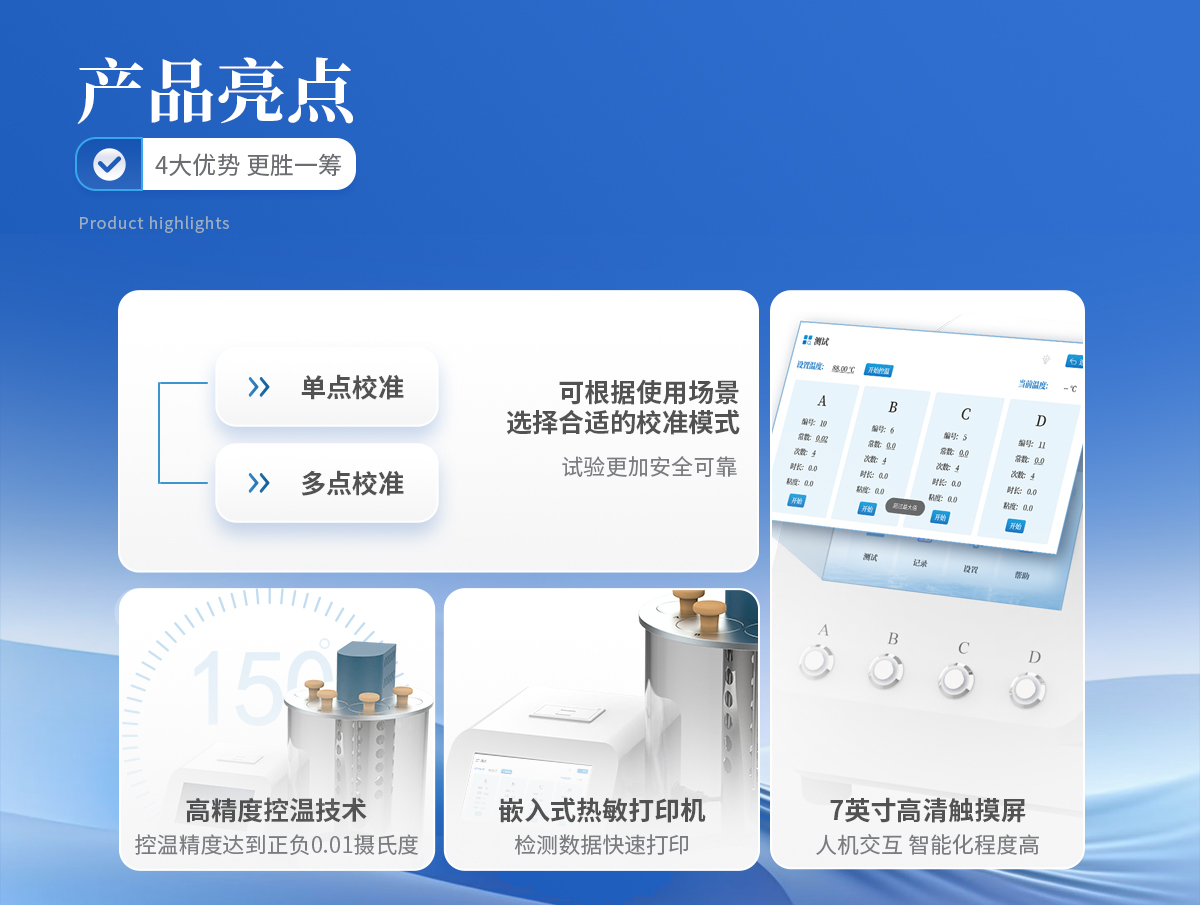 | 測試方法:品氏、烏氏兩種。 | 溫度范圍:室溫~+150°C精度±0.01°C。 | 溫度傳感器:德國A級Pt100不銹鋼探頭,內置溫度校正,檢測結果可靠。 | 加熱方式:電加熱單元,**加熱功率1600W。 | 顯示:7寸工業彩色觸摸屏。 | 溫度校正:單點校準、多點校準可選。 | 數據存儲:10000組測試結果。 | 尺寸:530*310*232.5(mm) | 工作環境: | 溫 度:10-35℃ | 濕 度:相對濕度不大于50% | 工作電壓:220V 50HZ |