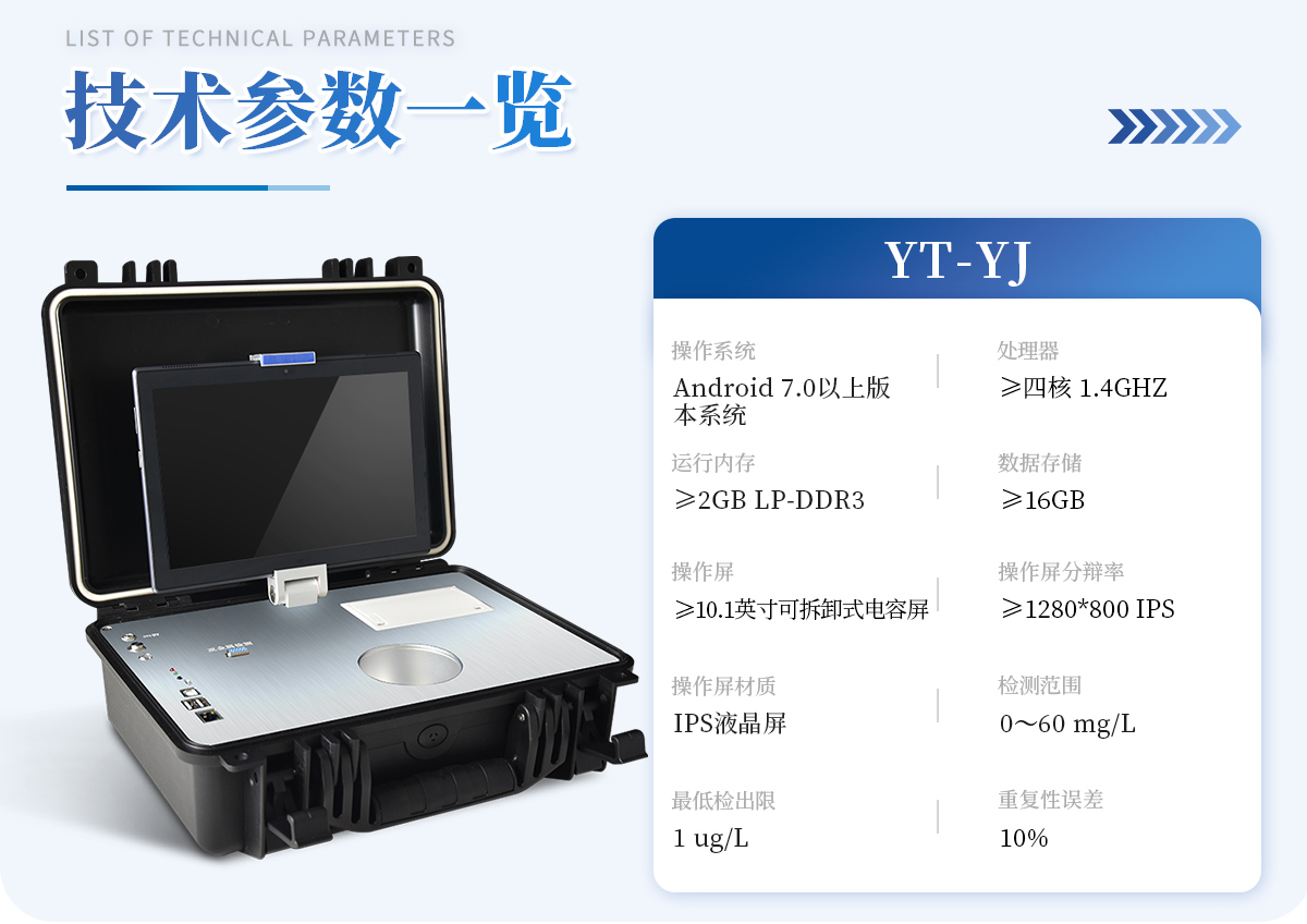 | 基本概述:便攜式箱體化一體機,采用防水、抗壓、防撞擊、防腐蝕箱體設計,滿足車載環境、無電源環境以及戶外檢測需求; | 主機:具備檢測功能、輔助功能、管理系統軟件、信息化管理功能,信息化實現數據雙向傳輸,能直接接收管理中心下發任務,并實時上報檢測結果至管理平臺; | 檢測技術:采用陽極溶出伏安法檢測技術; | 操作系統:Android 7.0以上版本系統; | 處理器:≥四核 1.4GHZ; | 運行內存:≥2GB LP-DDR3; | 數據存儲:≥16GB; | 通訊接口:包含兩個USB接口、網線接口、WIFI、藍牙、4G模塊,內置GPS接口,用于戶外或者其他移動檢測定位; | 指示燈:具有熱敏打印機工作指示燈,用于提示打印機工作狀態;具有電源充電指示燈,用于提示儀器充電狀態;具有無線藍牙對接狀態提示燈,用于提示操作平臺與儀器主機連接狀態;具有儀器工作狀態提示燈,用于提示儀器主機是否處于工作狀態; | 操作屏:≥10.1英寸可拆卸式電容屏設計,操作屏可以固定在儀器上,也可以取出單獨操作實現運程控制; | 操作屏分辯率:≥1280*800 IPS; | 操作屏材質: IPS液晶屏; | 輸入方式: 電容屏、觸摸輸入、支持多點觸控; | 采用無汞電極,安全無毒; | 模塊自帶攪拌功能,啟動后既可自動攪拌溶液。 | 檢測范圍: 0~60 mg/L ,**檢出限:1 ug/L; | 重復性誤差: 10%; | 具有自動尋峰功能,計算出樣品**數據; | 內置線性掃描、常規脈沖掃描、微分脈沖掃描; | 儀器現場取證功能: 儀器具有800萬以上防抖、自動對焦高清攝像頭,對檢測實樣進行現場拍照取證; | 電源控制器: 雙電源控制器,節省電量; | 運程控制:支持20米內無線藍牙控制儀器檢測,方便使用者沒在儀器身邊時也能完成項目檢測; | 打印: 內置微型熱敏打印機,可隨時打印檢測結果; | 電池:內置大容量可充電鋰電池,可連續工作5小時以上; | 箱體: 便攜一體化手提箱,箱體能防水,抗壓,整機重量小于5kg,攜帶方便; |