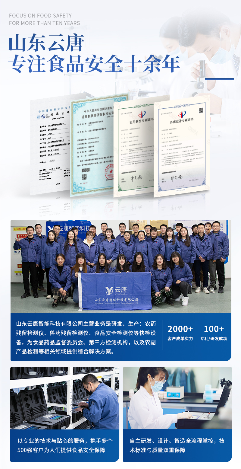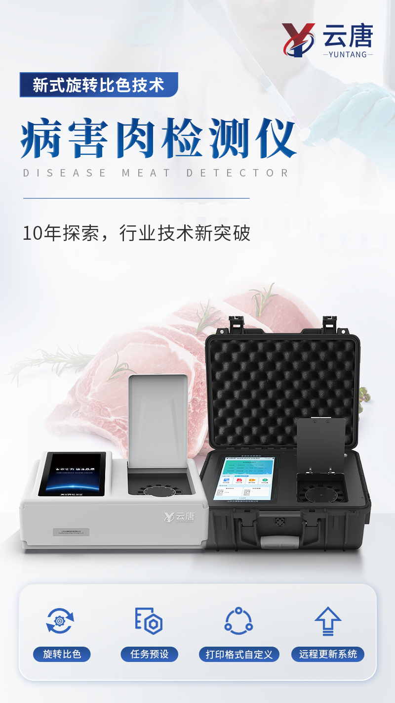 山東云唐智能科技有限公司生產的病害肉檢測儀為集成化食品安全快速檢測分析設備,采用手提箱一體化設計,可對豬肉、牛肉、羊肉、魚類等存在的病害肉組胺、揮發性鹽基氮進行快速定量檢測,儀器預留其他項目檢測程序和端口,根據日后需求可進行遠程升級。 該病害肉檢測儀為集成化食品安全快速檢測分析設備,目前已于市場監管局、食品肉產品深加工企業、學校食堂、衛生部門、畜牧部門、屠宰場、檢驗檢疫部門等單位廣泛使用。