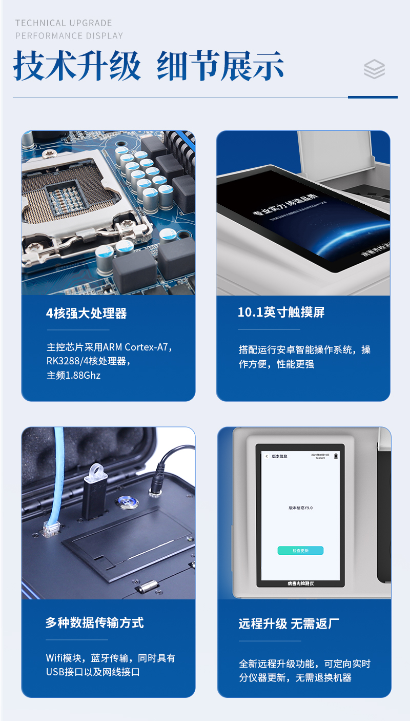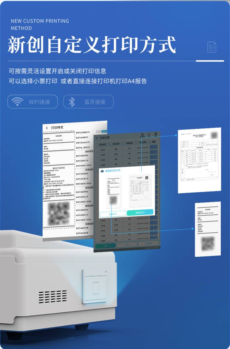 | 儀器采用手提一體化系統檢測技術,將分光光度模塊、數字化管理模塊、無線通訊模塊高度集成于一體,可支持檢測60種食品安全檢測項目,同時預留升級檢測方法。 | 儀器檢測模塊標準化、智能化,檢測項目可隨意自由組合。檢測箱體內置多個標準檢測單元,檢測模塊可以調整配置。 | 顯示屏幕:儀器采用10.1英寸豎向液晶觸摸屏顯,搭配運行安卓智能操作系統,主控芯片采用ARM Cortex-A7,RK3288/4核處理器,主頻1.88Ghz,操作方便,性能更強。 | 檢測通道:≥12通道;采用精密旋轉比色池設計,使用同芯片同光源校準精度,解決不同光源之間的誤差值,更加準確**。(1-12通道間誤差0.1%,***:**202022821055.2) | 儀器光源:高精度進口四波長冷光源,每個通道均配置 410、520、590、630nm 波長光源,標配**的光路切換裝置,專利光路切換功能可實現64波長,并且所有檢測項目可實現所有通道同時檢測。 | 設備可一鍵校準,自動保存校準數據,自動對比校驗,得到精準光源,采用Android SP存儲數據,光源數據永不丟失,方便每一次使用。 | 通訊接口: 配備無線通信模塊、4G(APN)通訊模塊、藍牙傳輸,同時具有雙USB接口以及RJ45網線接口,可以多方式實現數據保存及數據傳輸。 | 存儲方式: 存儲方式:支持U盤存儲,標準USB接口,免驅動安裝。檢測結果存儲容量20萬條以上,可生成Excel表格進行拷貝,并具有登錄保護功能。 | 智能化操作系統: | 操作系統:儀器可在同一檢測界面自動對應相關檢測通道,一次性選擇1-12個樣品名稱,無需退出界面,節省操作時間。并可以對每個通道屬性和樣品信息單獨進行編輯,例如送檢單位、人員,檢測人員等,打印時勾選打印顯示。 | 數據集成系統:設備首頁自動匯總分析檢測數據,包含:周檢測數據、月檢測數據,全部檢測總數量,包含檢測總數,合格數,不合格數,以及相關柱形分析圖,各項檢測數據一目了然,無需電腦查詢,更加快捷直觀。 | 數據庫系統:十幾項數據庫分類管理儀器:包含項目類型、項目數據、檢測數據、歷史記錄、國標信息、曲線信息、采樣信息、檢測信息、受檢信息、復核信息、圖表信息、光源校準信息、打印樣式信息、樣品庫信息等等,數據庫之間互相協調聯動保證數據的真實完整性。同時產品數據庫以及歷史檢測記錄支持一鍵檢索功能。 | 限量規判系統:具有限量查詢、添加物質合規判定系統。檢測出結果后,系統自動調用系統數據庫中相關國標進行比對判定,客觀顯示判定結果是否合格。 | 項目預設系統:儀器具有任務預設模塊,一鍵提前預設,給出方便快捷的新檢測方案,每一個任務分別可以設置不同的樣品、批次、編號、來源、備注、抽樣信息、檢測信息、受檢信息、復核信息等更多信息。樣品送檢時一鍵調取保存信息,并可多次調取,大大提高檢測效率。 | 數據監管系統:同步對接監管平臺,數據可局域網和互聯網數據上傳,檢測結果可直接傳至食品安全監管平臺。進行區域食品安全監管及大數據分析處理與數據統計,監測區域食品安全長短期動態及問題預估、預警。 | 全新打印系統:內置全新打印機,新創自定義打印方式,可按需靈活勾選控制:二維碼,抽樣信息、檢測信息,受檢信息、復核信息、抽樣日期、檢測日期等信息的打印。 | A4紙版本報告打印功能(可選配):設備擁有兩種結果展示方式,可以自動生成A4打印模板和小票打印模板兩種樣式,可通過WiFi及網線等方式鏈接外置打印機可進行打印。 | 供電模式:儀器交直流兩用,直流12V供電,可連接車載電源,可配6ah大容量充電鋰電池,電量可實時顯示,方便戶外流動測試。 | 儀器具備遠程升級功能,可定向分客戶分儀器更新,開機后自動更新,并可持續性免費更新系統版本,無需像傳統產品返廠更新,節省時間及人力成本并避免了物流運輸返廠升級導致設備損壞的潛在風險。 |