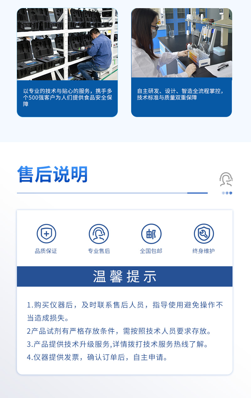 | 儀器采用10.1英寸液晶觸摸屏顯,搭配運行安卓智能操作系統(tǒng),主控芯片采用ARM Cortex-A7,RK3288/4核處理器,主頻1.88Ghz,運轉(zhuǎn)速度更快速,性能更強。 | 儀器功能包括:膠體金檢測模塊、數(shù)字化管理模塊、無線通訊模塊等,可以滿足同一軟件下實現(xiàn)所有檢測項目的檢測,并在同一窗口展示檢測結(jié)果。 | 一體化便攜式快檢設(shè)備,采用交直流兩用供電方式,可連接車載電源,配備6ah大容量充電鋰電池,可以滿足現(xiàn)場及流動檢測使用的需求。儀器尺寸:43×35×20cm, 主機凈重:5.1kg | 系統(tǒng)自帶數(shù)據(jù)集成模塊,設(shè)備首頁自動統(tǒng)計檢測數(shù)據(jù)包含:周檢測數(shù)據(jù)、月檢測數(shù)據(jù),全部檢測總數(shù)量,均包含檢測總數(shù),合格數(shù),不合格數(shù),以及相關(guān)柱形分析圖,對各項檢測數(shù)據(jù)清晰掌握,無需電腦查詢,更加快捷直觀。 | 儀器具有任務(wù)預(yù)設(shè)模塊,可在樣品送檢前提前預(yù)設(shè)樣品名稱、檢測指標(biāo)、送檢單位等信息,樣品送檢時一鍵調(diào)取保存信息,檢測更加方便快捷。 | 軌道式自動傳輸掃描方式,可實時顯示金標(biāo)卡實時圖像,系統(tǒng)自動分析并呈現(xiàn)出CT曲線圖,CT線自動識別,無需手動調(diào)整,完成檢測后自動退出檢測卡。 | 結(jié)果判定線可修改,對照值標(biāo)定值可保存,斷電不丟失數(shù)據(jù)。 | 兼容市場上其他膠體金卡,使用耗材不受限制,極大增強用戶使用體驗。 | 儀器檢測系統(tǒng)擁有龐大數(shù)據(jù)庫,并且構(gòu)建了完善的檢索、修訂功能。食品庫涵蓋多種樣品名稱,可按需添加或刪除、編輯樣品名稱;產(chǎn)品數(shù)據(jù)庫以及歷史檢測記錄支持一鍵檢索功能。 | 系統(tǒng)打印自定義化,打印格式多樣化,產(chǎn)品合格證(國家標(biāo)準(zhǔn)要求),二維碼,抽樣信息、檢測信息,受檢信息、復(fù)核信息、抽樣日期、檢測日期等信息結(jié)果,可按需求自行設(shè)置打印內(nèi)容。 | A4紙版本報告打印功能(可選配):設(shè)備擁有兩種結(jié)果展示方式,可以自動生成A4打印模板和小票打印模板兩種樣式,可通過WiFi及網(wǎng)線等方式鏈接外置打印機可進行打印 | 儀器具有wifi聯(lián)網(wǎng)上傳、RJ45網(wǎng)線連接功能,可以快速上傳數(shù)據(jù)。同步對接監(jiān)管平臺,數(shù)據(jù)可局域網(wǎng)和互聯(lián)網(wǎng)數(shù)據(jù)上傳,檢測結(jié)果直接傳至食品安全監(jiān)管平臺。進行區(qū)域食品安全監(jiān)管及大數(shù)據(jù)分析處理與數(shù)據(jù)統(tǒng)計,檢測區(qū)域食品安全長短期動態(tài),達到食品安全問題預(yù)估、預(yù)警。 | 設(shè)備支持U盤存儲,標(biāo)準(zhǔn)USB接口,免驅(qū)動安裝。檢測結(jié)果存儲容量20萬條以上,可生成Excel表格,進行一鍵拷貝,并具有登錄保護功能,可設(shè)置用戶名及密碼,規(guī)范不同人員操作權(quán)限,防止非工作人員操作,并且可以進行重新校準(zhǔn)、鎖定、恢復(fù)出廠設(shè)置功能。儀器固件可升級,后期檢測項目可擴充。 | 儀器具備遠程升級功能,可定向分客戶分儀器更新,開機后自動更新,并可持續(xù)性免費更新系統(tǒng)版本,無需像傳統(tǒng)產(chǎn)品返廠更新,節(jié)省時間及人力成本并避免了物流運輸返廠升級導(dǎo)致設(shè)備損壞的潛在風(fēng)險。 |