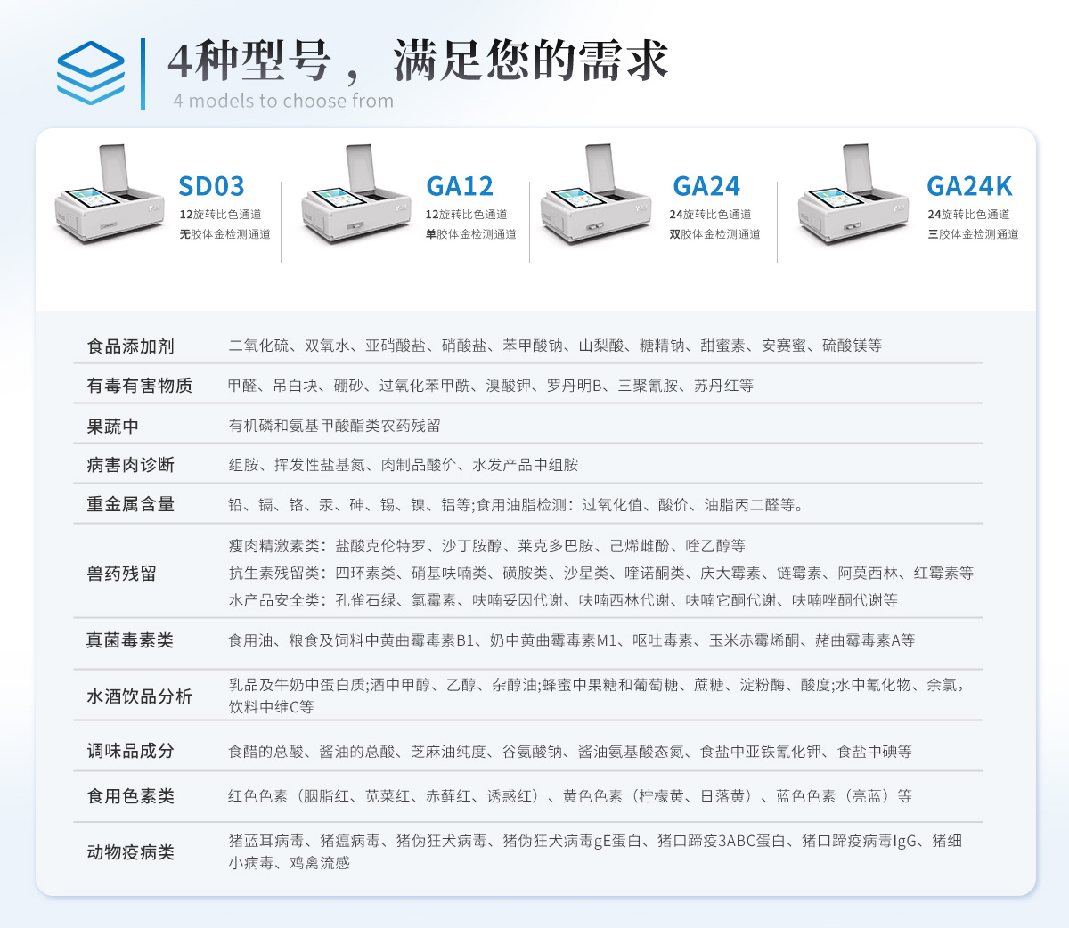 | 食品添加劑:二氧化硫、雙氧水、亞硝酸鹽、苯甲酸鈉、硝酸鹽、山梨酸鉀、山梨酸、安賽蜜、糖精鈉、甜蜜素、木耳硫酸鎂、茶多酚等 | 有毒有害物質:甲醛、吊白塊、硼砂、面粉中鋁、硫酸鋁鉀、過氧化苯甲酰、溴酸鉀、羅丹明B、蘇丹紅、工業堿、尿素、明礬等 | 果蔬:農藥殘留 | 病害肉:組胺、揮發性鹽基氮 | 重金屬含量:鉛、鎘、鉻、汞、砷、錫、鎳、鋁等 | 水產品安全類:孔雀石綠、氯霉素、呋喃妥因、呋喃西林、呋喃它酮、呋喃唑酮等 | 瘦肉精激素類(獸藥):鹽酸克倫特羅、沙丁胺醇、萊克多巴胺、己烯雌酚等 | 抗生素殘留:四環素類、硝基呋喃類、磺胺類、β-興奮劑類、沙星類、磺胺類、喹諾酮類,甲砜霉素,氟苯尼考,金剛烷胺、替米考星、慶大霉素、林可霉素、鏈霉素、恩諾沙星、環丙沙星、頭孢啦啶、青霉素、阿莫西林等 | 真菌毒素類:食用油、糧食及飼料中黃曲霉毒素B1、黃曲霉毒素總量,奶中黃曲霉毒素M1、嘔吐毒素、玉米赤霉烯酮、赭曲霉毒素A、T2毒素、伏馬毒素等 | 酒類及乳品牛奶中蛋白質:酒中甲醇、乙醇、乳品及牛奶中蛋白質、乳品硫氰酸鈉、三聚氰胺 | 調味品成分:食醋的總酸、醬油的總酸、芝麻油純度、谷氨酸鈉、醬油氨基酸態氮、食鹽中亞鐵氰化鉀、食鹽中碘等 | 食用色素類:紅色色素(胭脂紅、莧菜紅、誘惑紅)、黃色色素(檸檬黃、日落黃、堿性橙)、藍色色素(亮藍、靛藍)等 | 動物疫病類:禽流感、新城疫、牛羊口蹄疫、牛羊結核病、牛羊包蟲、牛羊布病、小反芻獸、豬藍耳病毒、豬瘟病毒、豬偽狂犬病毒、豬細小、豬圓環、犬細小病毒、犬瘟熱病毒、犬狂犬病毒等 | 蜂蜜中:果糖和葡萄糖、蔗糖、淀粉酶、酸度等 | 食用油檢測:過氧化值、酸價等 | 蛋類藥物殘留:氯霉素,四環素,磺胺類,喹諾酮類,呋喃西林,呋喃它酮,呋喃妥因,呋喃唑酮,氟苯尼考,阿莫西林、頭孢氨芐、紅霉素、鏈霉素等 |