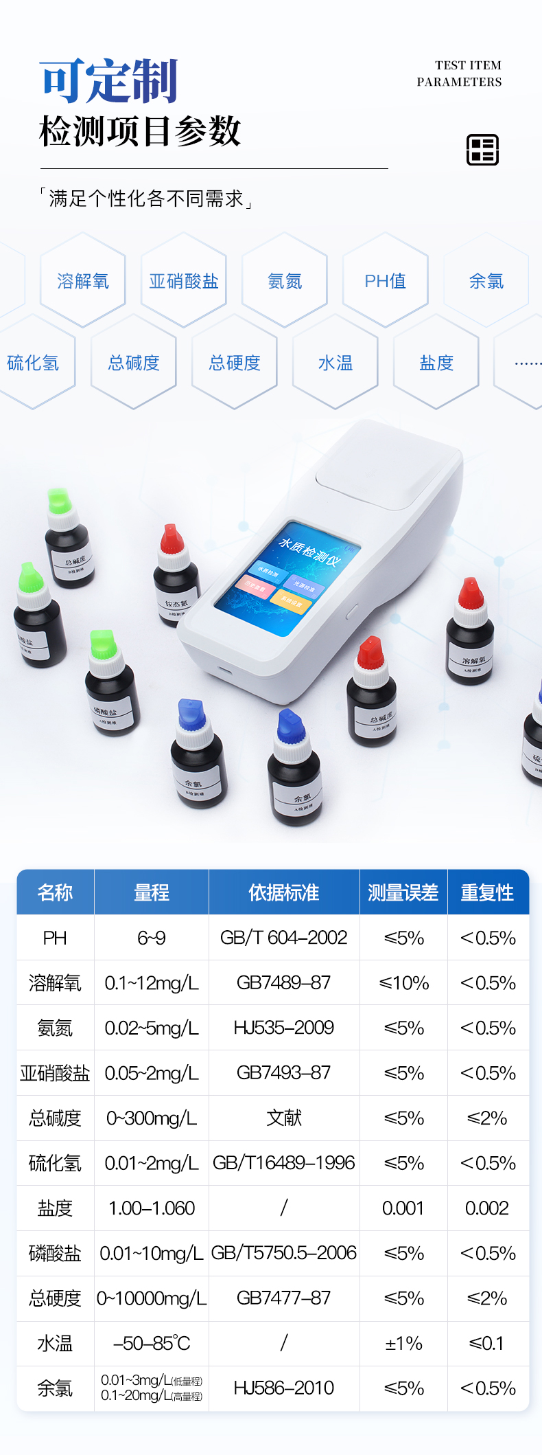 | 參數名稱 | pH | 溶解氧 | 氨氮 | 亞硝酸鹽 | 總堿度 | 硫化氫 | 鹽度 | 磷酸鹽 | 總硬度 | 水溫 | 余氯 |