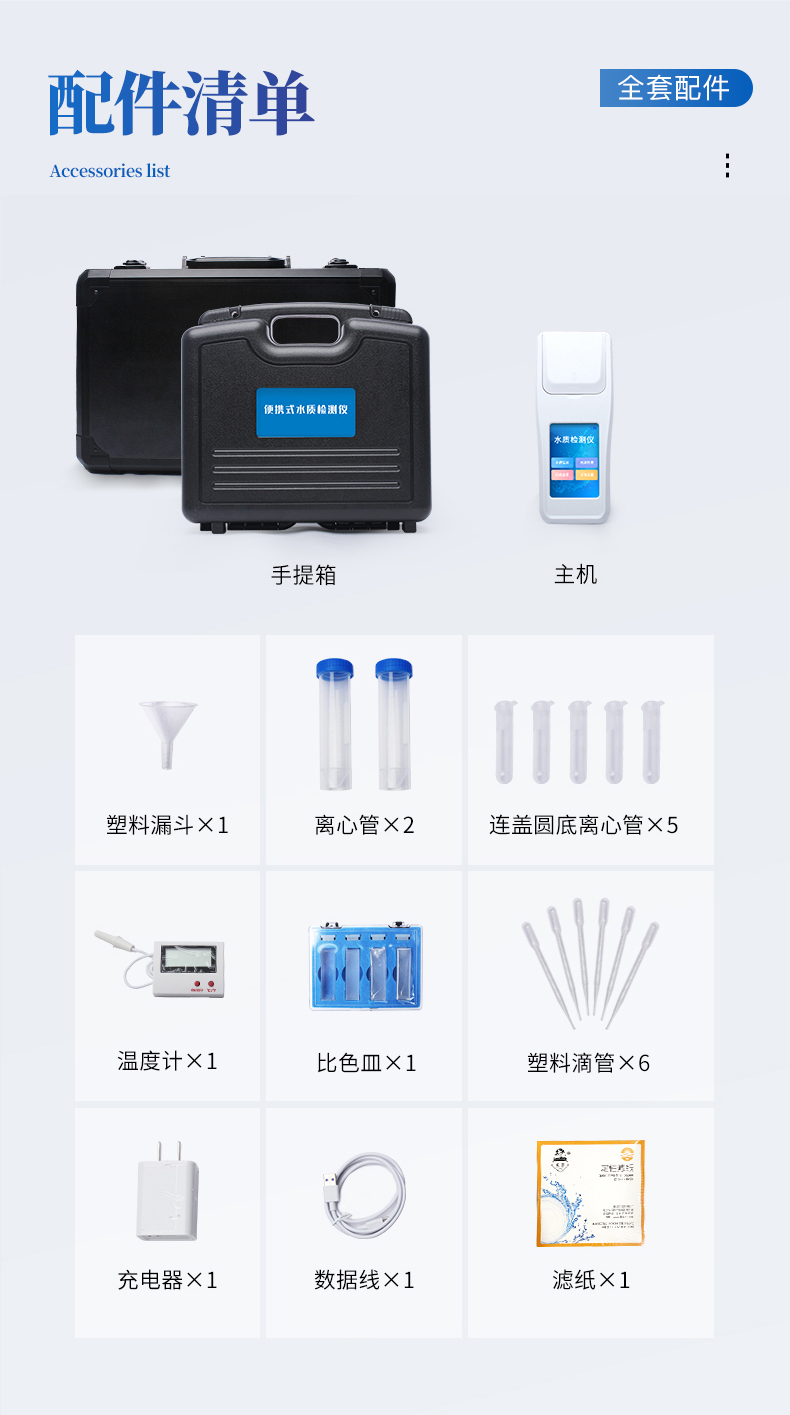 | 儀器主機1臺 | 量杯1只 | 離心管2只 | 連蓋圓底離心管5只 | 塑料漏斗1只 | 比色皿1盒 | 塑料滴管6只 | 濾紙1盒 | 數據線1根 | 充電器1個 |