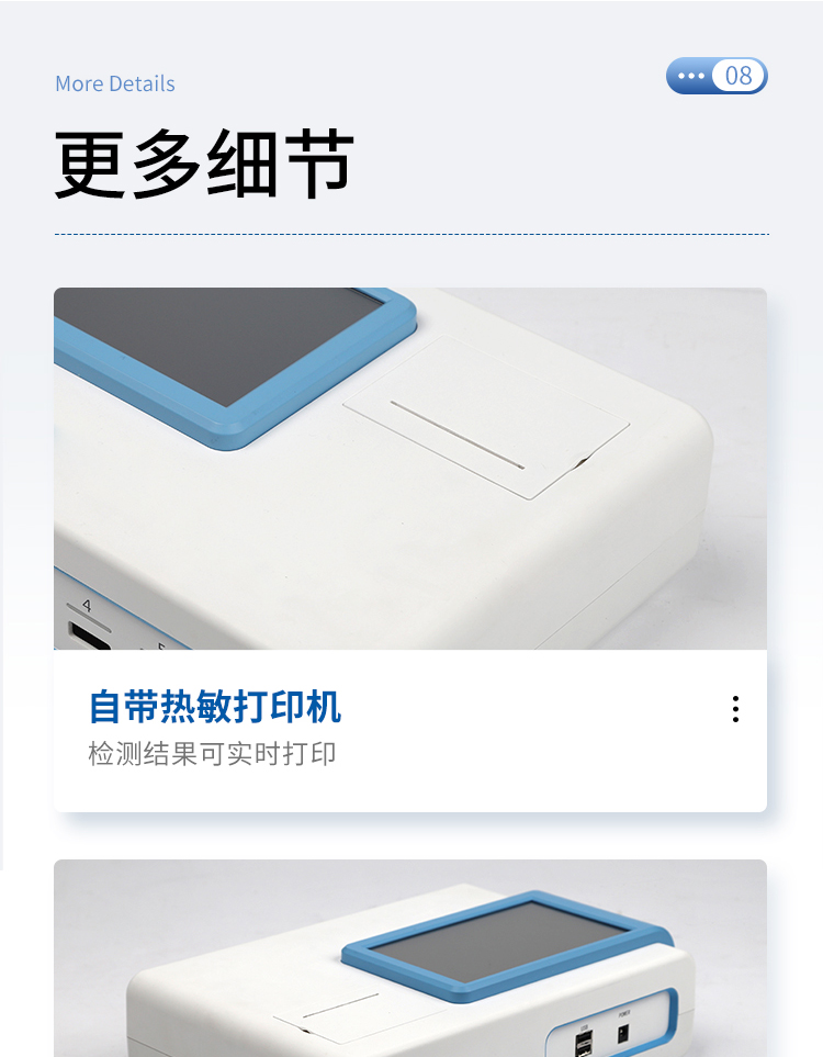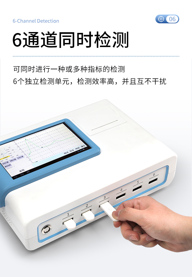 | 一體化設計,集成孵育和檢測功能同時進行,孵育完成直接檢測; | 全中文 7英寸高清液晶顯示,觸摸屏操作; | Android 系統,支持在線升級,可WIFI聯網; | 檢測原理:熒光定量免疫層析法; | 6通道設計,可同時進行一種或多種指標的檢測,6個獨立檢測單元,檢測效率高,并且互不干擾; | 具有二維碼自動識別系統,可直接識別檢測項目、檢測流程等信息; | 儀器自帶熱敏打印機,檢測結果可實時打印; | 具有檢測數據存儲(存儲數量不少于 10000 條)、查詢、批量數據處理和打印功能; | 儀器≥2 個USB 接口,可拷貝結果及原始數據,具有 wifi 接入模塊,可通過無線連接網 絡實現數據上傳; | 分鐘內達到工作狀態(37℃),封閉系統,不受外界環境(光、熱)干擾,工作環境溫度:0-30℃; | 相對極差≤10%; | 重復性 CV≤1%; | 批間變異≤3%; | 尺寸310x210x93mm |