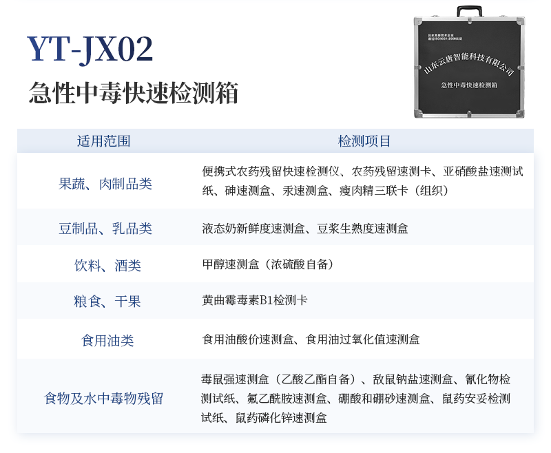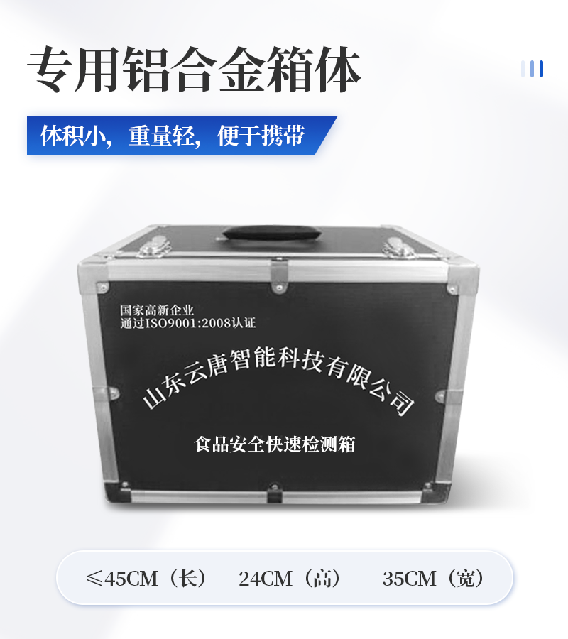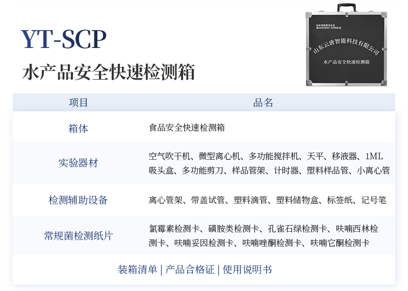 咨詢熱線:18765738993 在線咨詢技術(shù)熱線水產(chǎn)品安全快速檢測箱 序號 項(xiàng)目品 名 規(guī) 格 檢出限 單位 數(shù)量 1 箱體 食品安全快速檢測箱I 便攜式 / 個(gè) 1 2 實(shí)驗(yàn)器材 空氣吹干機(jī) 功率:450W / 個(gè) 1 微型離心機(jī) 5000轉(zhuǎn)/分鐘 / 個(gè) 1 多功能攪拌機(jī) 轉(zhuǎn)速:18000-22000轉(zhuǎn)/分鐘 / 臺 1 天平 0.1-200g / 個(gè) 1 移液器 1mL / 個(gè) 1 1ml 吸頭盒 內(nèi)含吸頭 / 個(gè) 1 多功能剪刀 - / 個(gè) 1 樣品管架 10ml / 個(gè) 1 計(jì)時(shí)器 - / 個(gè) 1 塑料樣品管 10ml / 個(gè) 20 小離心管 1.5ml / 個(gè) 50 3 水產(chǎn)品安全快速檢測卡 氯霉素檢測卡 10次/盒 0.3ppb 盒 1 磺胺類檢測卡 10次/盒 20ppb 盒 1 孔雀石綠檢測卡 10次/盒 2ppb 盒 1 呋喃西林檢測卡 10次/盒 0.5ppb 盒 1 呋喃妥因檢測卡 10次/盒 0.5ppb 盒 1 呋喃唑酮檢測卡 10次/盒 0.5ppb 盒 1 呋喃它酮檢測卡 10次/盒 0.5ppb 盒 1 4 裝箱清單 —— —— —— 份 1 5 產(chǎn)品合格證 —— —— —— 份 1 6 使用說明書 —— —— —— 份 1 |