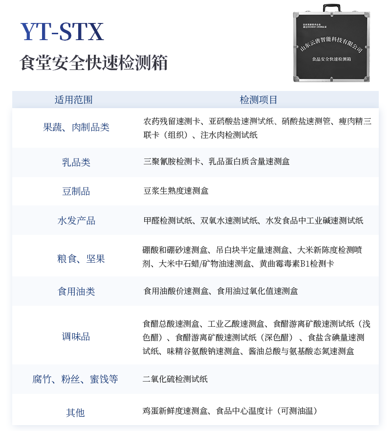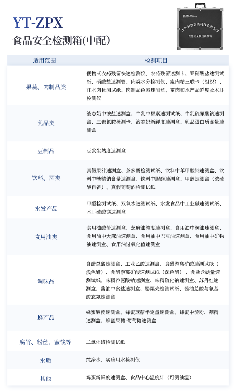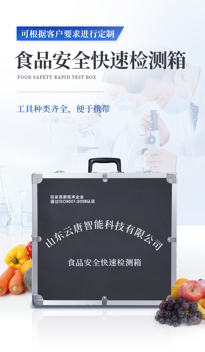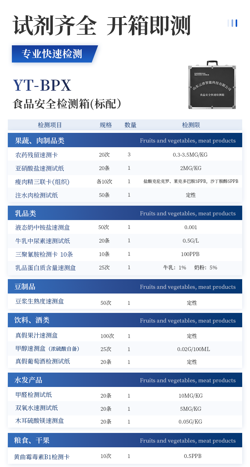 水產品安全快速檢測箱 序號 適用范圍 檢測項目 規格 單位 數量 檢測限 檢測范圍 1 果蔬、肉制品類 農藥殘留速測卡 20次 盒 5 0.3-3.5mg/kg / 亞硝酸鹽速測試紙 20條 套 1 2mg/kg 0-40mg/kg 硝酸鹽速測管 20次 盒 1 0.5mg/kg 0.5-10mg/kg(以N計) 瘦肉精三聯卡(組織) 各10次 包 1 鹽酸克倫克羅、萊克多巴胺3ppb,沙丁胺醇5ppb / 注水肉檢測試紙 50條 袋 1 定性 / 2 乳品類 三聚氰胺檢測卡 10條 包 1 100ppb / 乳品蛋白質含量速測盒 25次 盒 1 牛乳:1% 奶粉:5% 牛乳0-5%; 乳粉0-25% 3 豆制品 豆漿生熟度速測盒 50次 盒 1 定性 / 4 水發產品 甲醛檢測試紙 20條 套 1 10mg/kg / 雙氧水速測試紙 20條 套 1 5mg/kg 0-30mg/kg 水發食品中工業堿速測試紙 20條 套 1 0.4g/L / 5 糧食、堅果 硼酸和硼砂速測盒 100次 盒 1 25mg/kg 定性 吊白塊半定量速測盒 100次 盒 1 2.5mg/kg 0-100mg/L 大米新陳度檢測噴劑 50次 盒 1 定性 / 大米中石蠟/礦物油速測盒 100次 盒 1 1.00% / 黃曲霉毒素B1檢測卡 10次 包 1 0.5ppb / 6 食用油類 食用油酸價速測盒 100次 盒 1 1mg/kg 0-8mg/kg 食用油過氧化值速測盒 100次 盒 1 0.09g/100g 0.09-0.45g/100g 7 調味品 食醋總酸速測盒 20次 盒 1 0.26g/100mL / 工業乙酸速測盒 100次 盒 1 定性 / 食醋游離礦酸速測試紙(淺色醋) 20條 套 1 0.50% / 食醋游離礦酸速測試紙(深色醋) 20條 套 1 0.50% / 食鹽含碘量速測試紙 20條 套 1 15mg/kg 0-40mg/kg 味精谷氨酸鈉速測盒 15次 盒 1 2.60% / 醬油總酸與氨基酸態氮速測盒 20次 盒 1 總酸: 0.45g/100mL氨基酸態氮:0.078g/100mL / 8 腐竹、粉絲、蜜餞等 二氧化硫檢測試紙 20條 套 1 15mg/kg 0-150mg/kg 9 其他 雞蛋新鮮度速測盒 10次 盒 1 定性 / 食品中心溫度計(可測油溫) -50~300℃ 支 1 / / 10 箱體預裝輔助設備 食品安全快速檢測箱I 便攜式 個 1 / / 便攜水浴鍋 功率300W 個 1 多功能剪刀 - 把 1 計算器 - 個 1 洗瓶 250ml 個 1 塑料滴管 3ml 根 10 塑料滴管 0.2ml 根 50 樣品管架 10ml 個 1 天平 0.1-200g 個 1 移液器 1mL 支 1 玻璃三角瓶 100ml 個 2 玻璃樣品管 10ml 個 2 小離心管 1.5ml 個 24 塑料樣品管 10ml 個 10 樣品瓶 50ml 個 2 離心管架 1.5ml 個 1 燒杯 250ml 個 1 量筒 100ml 個 1 手套 - 包 1 計時器 - 個 1 槍頭 1ml 個 20 組織提取器 便攜式 個 1 錫箔紙 10張/包 包 1 裝箱清單 - 份 1 產品合格證 - 份 1 使用說明書 - 份 1 |
