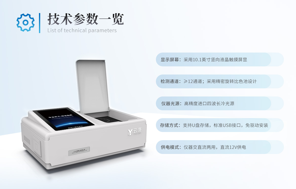 | 儀器采用臺式一體化系統檢測技術,將分光光度模塊、新型農殘檢測模塊、數字化管理模塊、無線通訊模塊高度集成于一體,支持檢測200種食品安全檢測項目,同時預留升級檢測方法。 | 儀器檢測模塊標準化、智能化,可隨意自由組合。檢測箱體內置多個標準檢測單元,檢測模塊可以調整配置。 | 儀器采用全新安卓智能系統,主控芯片采用 ARM Cortex-A7,RK3288/4核處理器,10.1寸高清液晶觸摸豎屏,更加**的UI交互界面,運轉快捷;儀器配備無線通信模塊: 4G(APN)通訊模塊、Wifi模塊,藍牙傳輸,同時具有雙USB接口以及RJ45接口能以多種方式實現數據保存和數據傳輸功能。 | 創新檢測模式: | ★檢測通道:≥12通道;采用精密旋轉比色池設計,使用同芯片同光源校準精度,解決不同光源之間的誤差值。1-12通道間誤差0.1%。(***:**202022821055.2) | ★儀器具有自動識別比色皿檢測功能,即:將樣品比色皿放入儀器后,點擊樣品檢測,儀器自動識別比色皿進行通道檢測。 | 進口高精光源: | 高精度進口四波長冷光源,通道配置 410、520、590、630nm 波長光源,一個光源芯片驅動一個光源,誤差極小,每臺設備單獨**校準光源,**比對,同時參照四種不同波段光源全方位覆蓋市面上99%的農殘食品項目檢測。 | 智能化操作系統: | 便捷操作系統:設備檢測時可在同一檢測界面自動對應相關檢測通道一次性選擇1-12個樣品名稱,無須退出界面,節省操作時間。 | 數據集成系統:設備首頁自動統計檢測數據包含:周檢測數據、月檢測數據,全部檢測總數量,均包含檢測總數,合格數,不合格數,以及相關柱形分析圖,對各項檢測數據清晰掌握,無需電腦查詢,更加快捷直觀。 | 項目預設系統:支持添加單個及多個相同或不相同的任務預設,一鍵快速調取,每一個任務分別可以設置不同的樣品、批次、編號、來源、備注、抽樣信息、檢測信息、受檢信息、復核信息等更多信息。無縫鏈接平臺和APP實時查看下發任務。 | 數據監管系統:同步對接監管平臺,數據可局域網和互聯網數據上傳,檢測結果可選擇直接傳至食品安全監管平臺。集成OSS輸出存儲服務、區分設備定向管理應用,進行區域食品安全監管及大數據分析處理與數據統計,檢測區域食品安全長短期動態,達到食品安全問題預估、預警。 | 自定義打印系統:內置全新打印系統,新創自定義打印方式,可按需靈活設置開啟或關閉:產品合格證(國家農業部標準要求),二維碼,抽樣信息、檢測信息,受檢信息、復核信息、抽樣日期、檢測日期等信息的打印。 | 系統遠程更新功能:可定向分客戶分儀器更新系統,按照不同客戶后期實際需求添加項目,無需機器返廠,即可遠程實時升級全新系統,節省時間成本及避免運輸造成設備損壞。 | 儀器主機采用一體化防水、抗壓、防撞擊、防腐蝕箱體設計,同時配備交直流供電,可連接車載電源,可選配大容量充電鋰電池,滿足現場野外檢測需求。 | 安全證書,放心保障:儀器具有中國計量科學研究院校準證書,權威認證。 |