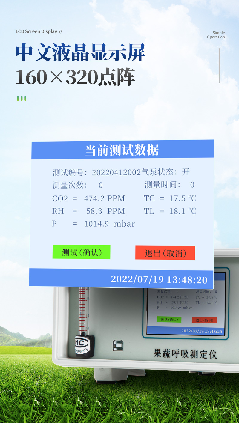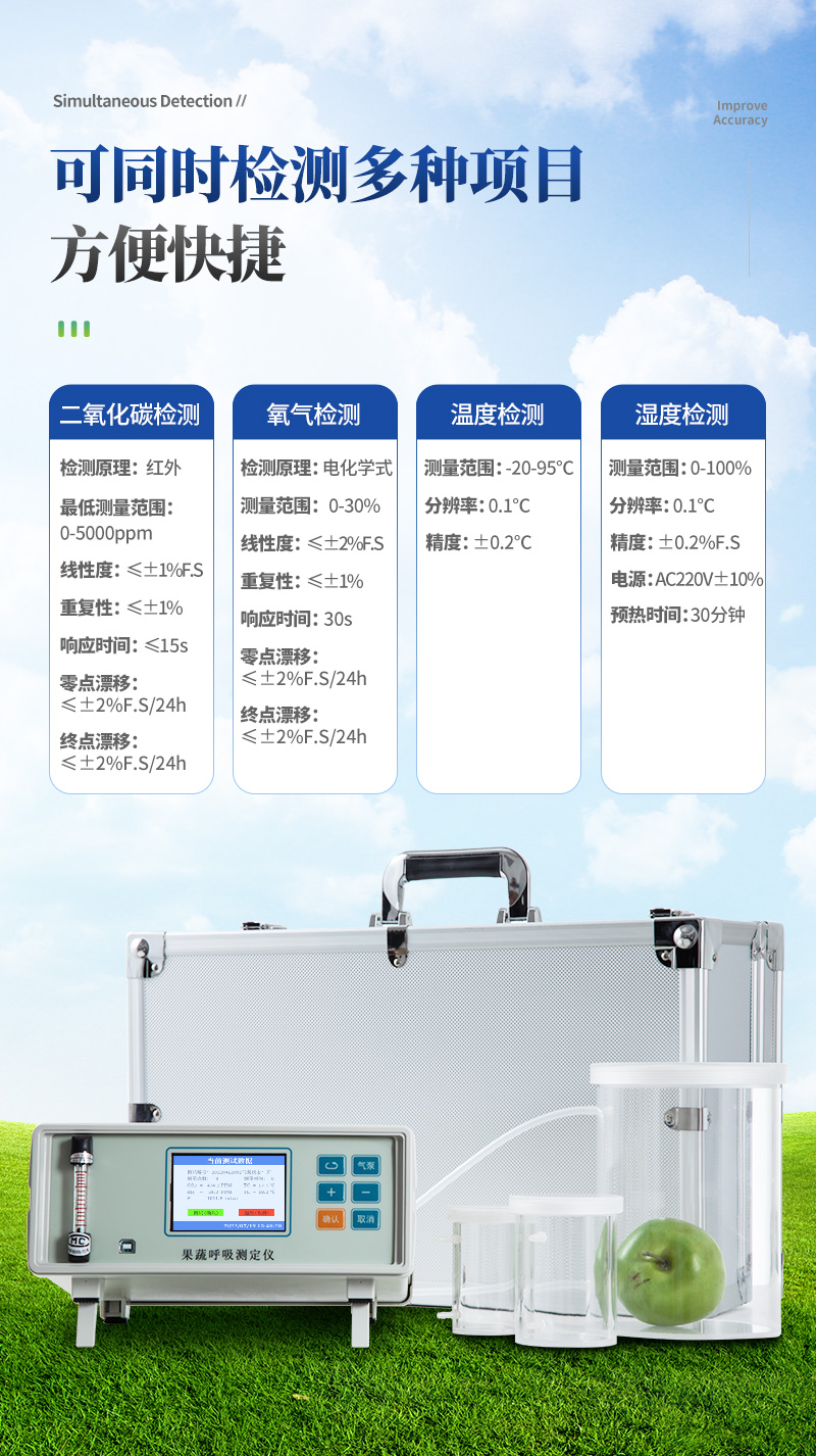 果蔬呼吸測定儀專門用于常溫、冷藏庫、氣調庫、超市冷柜等儲藏條件下的果品和蔬菜呼吸強度的測定和分析研究。該儀器的特點是可以根據果蔬的 大小來選擇不同體積的呼吸室,加快了平衡和測定時間;可以同時顯示呼吸室的CO2濃度、O2濃度、溫度和濕度。該儀器具有多功能、高精度、快速、**、方 便等特點,非常適合于食品,園藝、果品、蔬菜、外貿等各類學校、科研院所用于各類果品和蔬菜的呼吸測定。