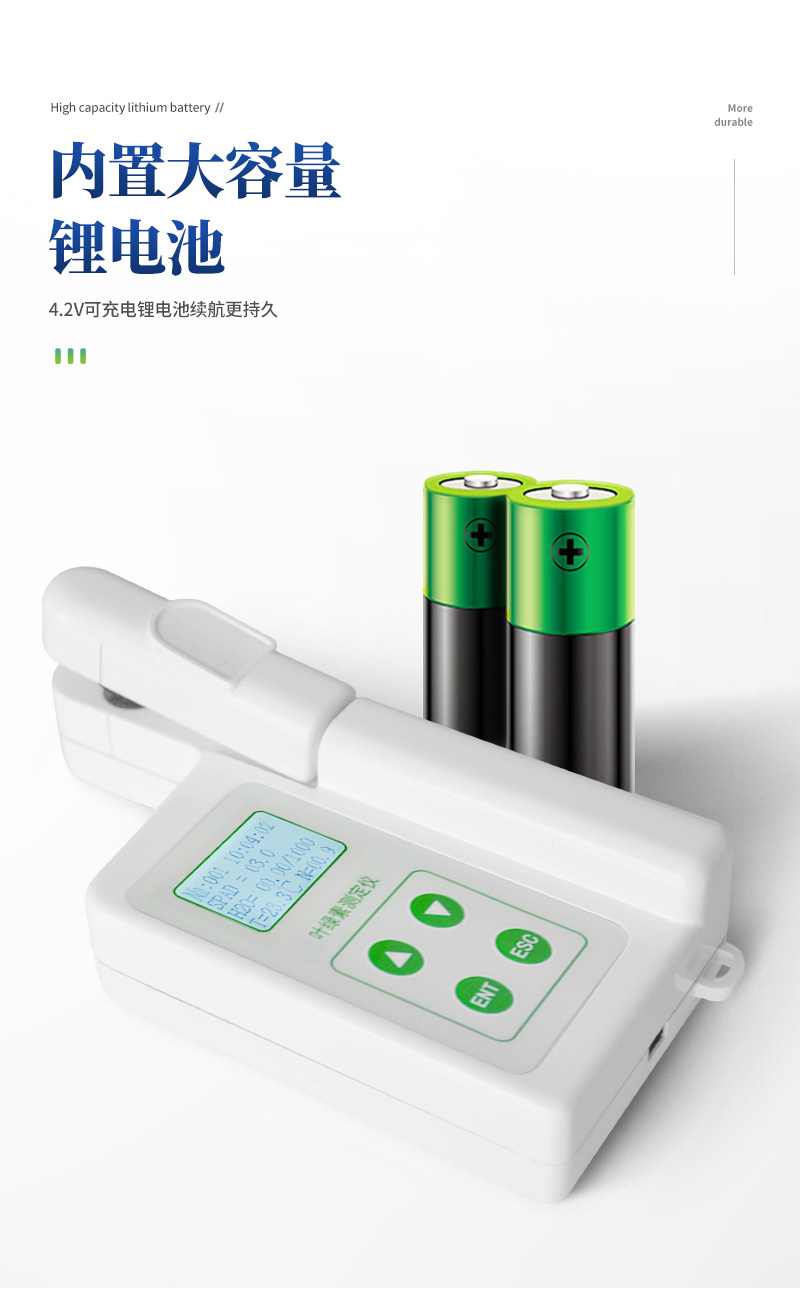 | 測定指標:氮素、葉綠素、葉溫 | 測量范圍: | 葉綠素:0.0-99.9SPAD 氮含量:0.0-99.9mg/g 葉面溫度:-10-99.9℃ | 測量精度: | 葉綠素:±1.0 SPAD單位以內 (室溫下,SPAD值介于0-50) 氮含量: ±5% 葉面溫度:±0.5℃ | 重復性: | 葉綠素:±0.3 SPAD單位以內 (SPAD值介于0-50) 氮含量:±0.5單位 葉面溫度:±0.2℃ | 測量面積:2mm*2mm | 測量時間間隔:小于3秒 | 數據存儲容量:1000組數據 | 電源:4.2V可充電鋰電池 | 電池容量:2000mah | 重量:200g |