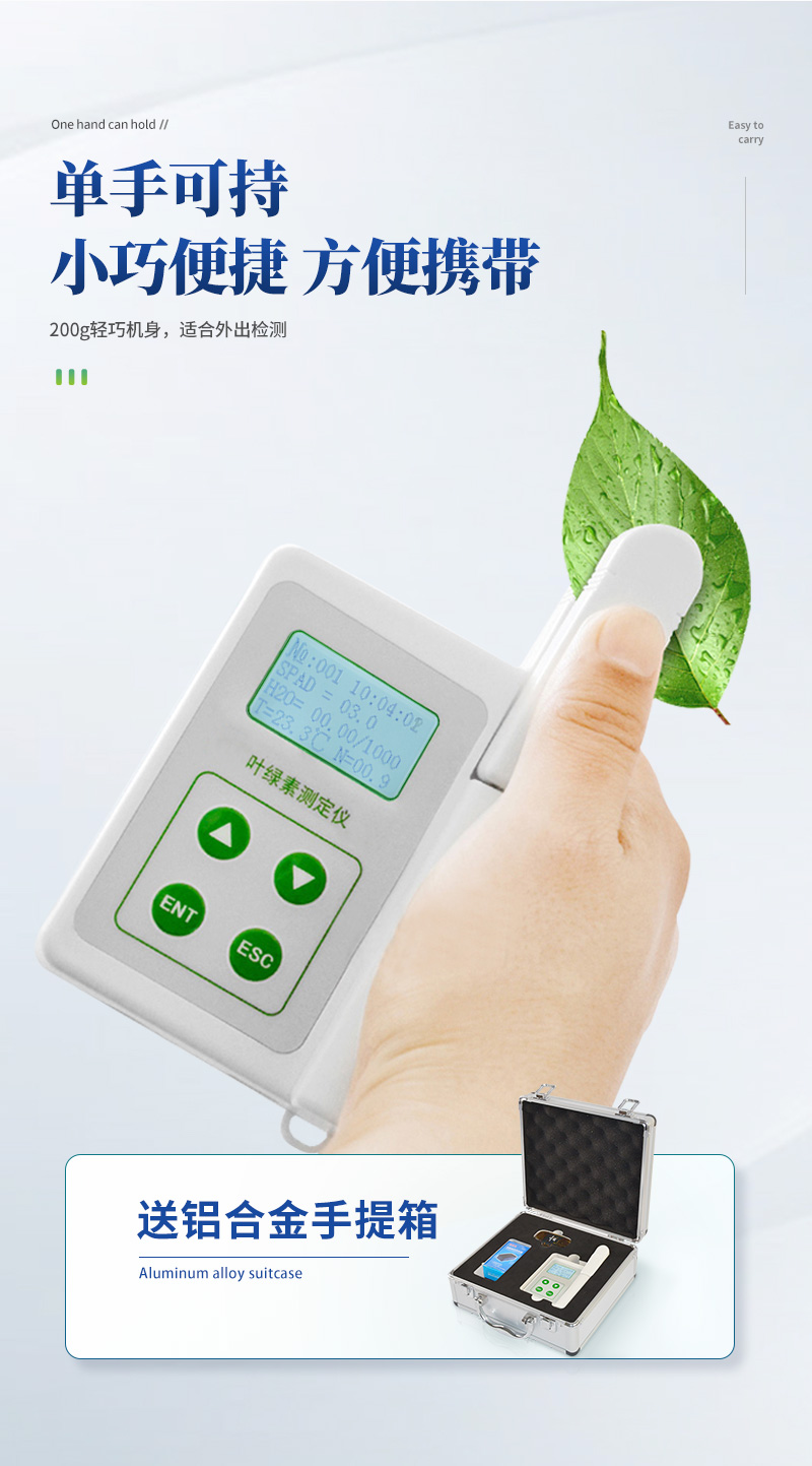 氮素含量一般情況下直接反應作物的健康情況,生長狀態、了解植物真實的硝基需求量和土壤硝基的缺乏程度或是否過多地施加了氮肥,廣泛應用于氮肥管理,除草劑應用,葉片衰老,環境脅迫等研究,葉綠素測量儀在農業種植過程中有很大的意義。 葉 綠素含量的測定結果是SPAD值,是葉片在兩種波長650nm 和940nm,葉片傳輸光的數量進行比值計算,來確定葉片當前葉綠素的相對數量(兩種波長范圍內的透光系數來確定葉片當前葉綠素的相對數量 ),SPAD值與葉綠素之間成正比關系,因此SPAD值往往間接地可代表葉綠素值,從而可以評估植物健康狀況、生長狀態,因而在農業中,時常使用葉綠素計 來進行對植物葉綠素含量進行檢測,以此來進行指導氮肥的施用量,因而在農業種植過程中使用葉綠素計來進行指導氮元素含量的施肥,同時在很多植物中,以此來 進行判斷植物的抗逆性。 葉溫常用來表示植物的體溫狀況,植物葉片中所有的化學反應,都受葉片溫度的影響,在植物生理活動的分析中經常用到。葉溫與 氣溫的差值,可以表明植物的缺水情況或受旱程度。因為當水分供應充足時,植物蒸騰正常,蒸騰耗熱可以降低植物體溫,這時葉溫比氣溫低;反之受旱時,植物體 溫上升,可高于當時的氣溫。