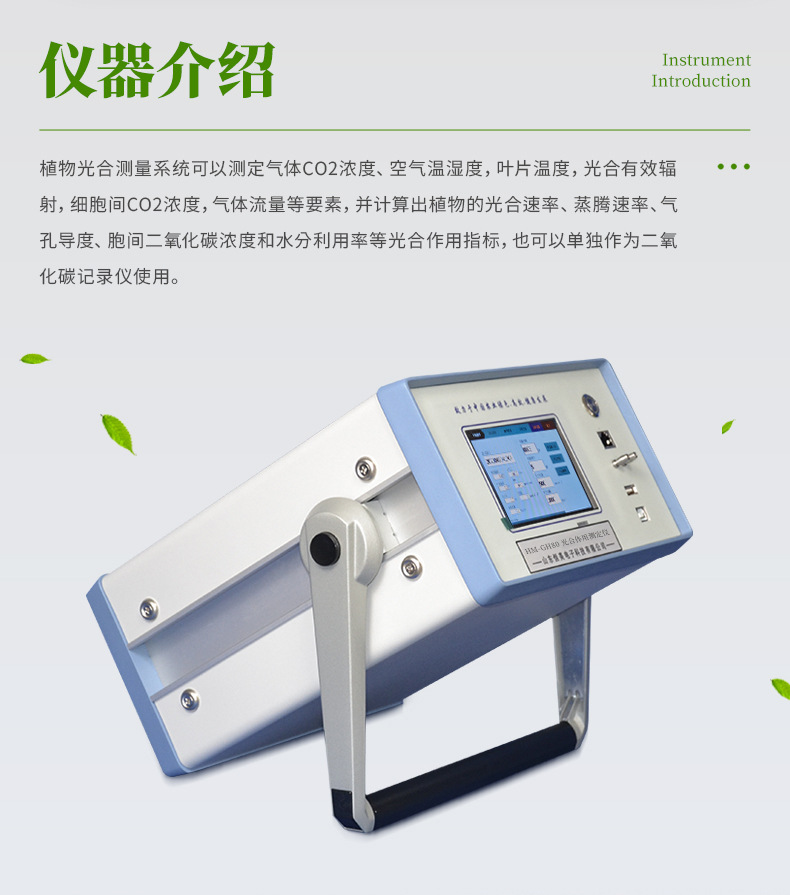 光合作用測定儀是通過測量植物葉片一定時間內CO2吸收(釋放)的量, 并同時測量空氣溫濕度,葉片溫度,光照強度以及同化CO2的葉片面積等要素,就可以直接計算出植物的光合速率、蒸騰速率、細胞間CO2濃度和氣孔導度等光合作用指標。該儀器具有靈敏度高、反應迅速,抗干擾性強,操作方便,可以進行活體的、連續的測定等突出優點,因而被廣泛應用于植物生理學、植物生物化學、生態環境、農業科學等多個領域。