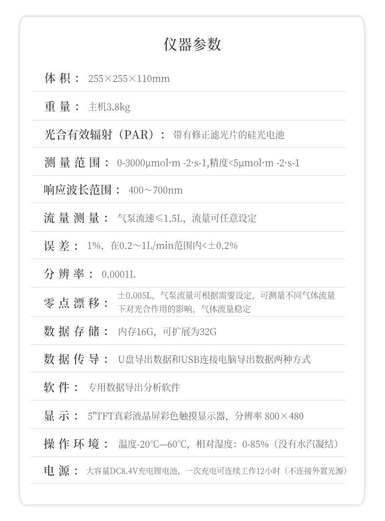 | CO2分析:加入了溫度調節的雙波長紅外二氧化碳分析器, 測量范圍:0-3000ppm,分辨率:0.1ppm; 精度3ppm。二氧化碳測量不受溫度變化影響,具有穩定、精度高,反映靈敏,1秒鐘之內就可以完成二氧化碳差值采集。 | 葉室溫度:德國賀利氏高精度數字溫度傳感器,測量范圍:-20-80℃,分辨率:0.1℃,誤差±0.2℃ | 葉片溫度:鉑電阻,測量范圍:-20-60℃,分辨率:0.1℃,誤差±0.2℃ | 瑞士進口高精度數字濕度傳感器:測量范圍0-85%,分辨率:0.1%,誤差≤ 1% | 光合有效輻射(PAR):帶有修正濾光片的硅光電池 | 測量范圍:0-3000μmol·m -2·s-1 ,精度<1μmol·m -2·s-1. 響應波長范圍:400~700nm | 流量測量:微型電子流量計,流量可任意設定。氣泵流速≤1.5L. 誤 差:1%,在0.2~1L/min范圍內<±0.2%,分辨率:0.0001L。 | 零點漂移:±0.005L,氣泵流量可根據需要設定,可測量不同氣體流量下對光合作用的影響,氣體流量穩定。 | 葉室尺寸:標配尺寸55×20mm,其他尺寸根據客戶需求定做 | 操作環境:溫度-20℃—60℃,相對濕度:0-85%(沒有水汽凝結) | 電源:大容量DC8.4V充電鋰電池,一次充電可連續工作12小時(不連接外置光源) | 數據存儲:內存16G,可擴展為32G。 | 數據傳輸:USB連接電腦可直接導出數據。 | 顯示:3.5"TFT真彩液晶屏彩色顯示器,分辨率 800×480,強光下清晰可見 | 按鍵:六按鍵,操作簡單方便 | 體積:260×260×130mm | 重量:主機3.25kg |