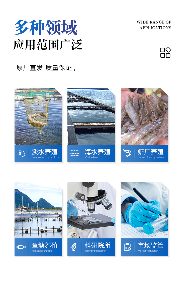 適用于純凈水廠、自來(lái)水廠、生活污水處理廠、工業(yè)污水、水產(chǎn)養(yǎng)殖、河流監(jiān)測(cè)、游泳場(chǎng)館、水源保護(hù)、生產(chǎn)監(jiān)測(cè)、科研實(shí)驗(yàn)等。