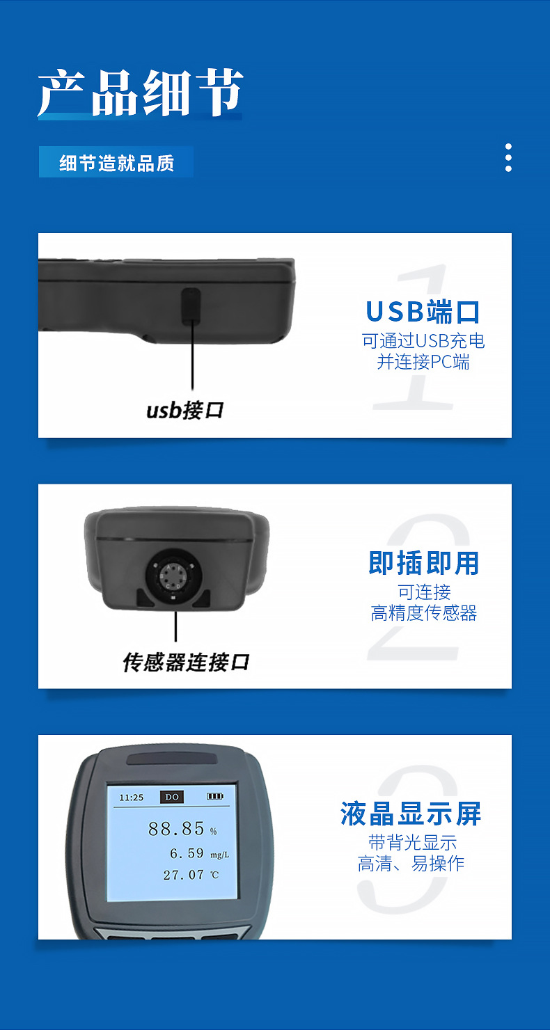 帶背光顯示和操作鍵盤,功能全面操作簡單,界面簡潔,溶解氧光學(xué)傳感器自動(dòng)識別,測量數(shù)據(jù)的讀取、存儲,傳感器校準(zhǔn)等功能,并且可以 USB 數(shù)據(jù)導(dǎo)出,實(shí)現(xiàn)更多**功能。追求高性價(jià)比是我們一貫的追求。