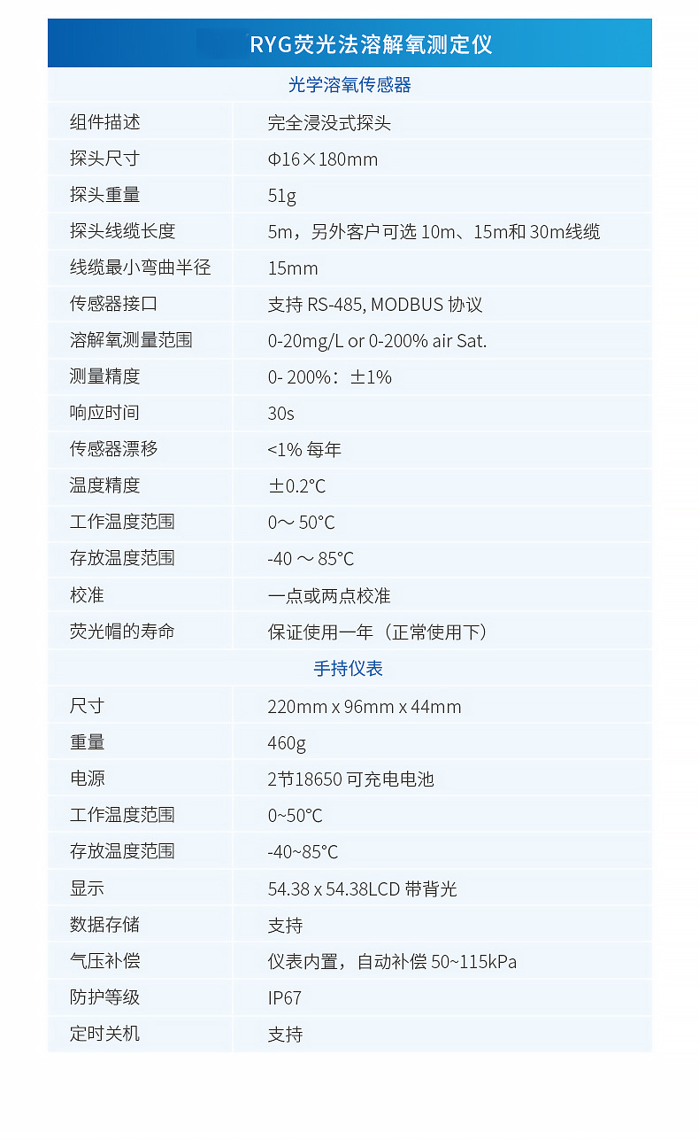 | 光學(xué)溶氧傳感器: | 1 組件描述:完全浸沒式探頭 | 2 探頭尺寸:Φ16×180mm | 3 探頭重量:51g | 4 探頭線纜長度:5m,另外客戶可選 10m、15m 和 30m 線纜 | 5 線纜*小彎曲半徑:15mm | 6 傳感器接口:支持 RS-485, MODBUS 協(xié)議 | 7 測量范圍:0-20mg/L or 0-200% air Sat. | 8 測量精度:0- 200%:±1% | 9 響應(yīng)時(shí)間:30s | 10 傳感器漂移:<1% 每年 | 11 溫度精度:±0.2℃ | 12 工作溫度范圍:0~ 50℃ | 13 存放溫度范圍:-40 ~ 85℃ | 14 校準(zhǔn):一點(diǎn)或兩點(diǎn)校準(zhǔn) | 15 熒光帽的壽命:保證使用一年(正常使用下) |