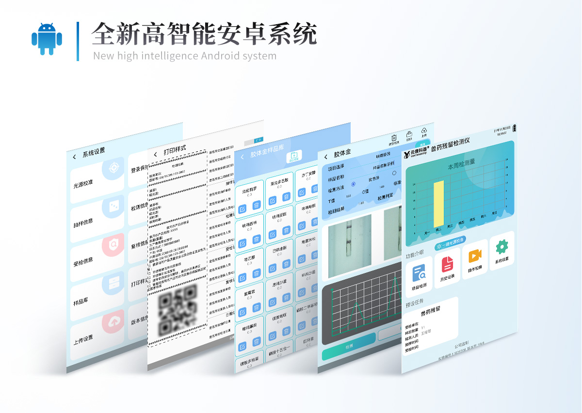 | 儀器采用10.1英寸液晶觸摸屏顯,搭配運行安卓智能操作系統,主控芯片采用ARM Cortex-A7,RK3288/4核處理器,主頻1.88Ghz,運轉速度更快速,性能更強。 | 儀器功能包括:膠體金檢測模塊、數字化管理模塊、無線通訊模塊等,可以滿足同一軟件下實現所有檢測項目的檢測,并在同一窗口展示檢測結果。 | 一體化臺式快檢設備,采用交直流兩用供電方式,可連接車載電源,配備6ah大容量充電鋰電池,可以滿足現場及流動檢測使用的需求。儀器尺寸:43×35×20cm, 主機凈重:5.1kg | 系統自帶數據集成模塊,設備首頁自動統計檢測數據包含:周檢測數據、月檢測數據,全部檢測總數量,均包含檢測總數,合格數,不合格數,以及相關柱形分析圖,對各項檢測數據清晰掌握,無需電腦查詢,更加快捷直觀。 | 儀器具有任務預設模塊,可在樣品送檢前提前預設樣品名稱、檢測指標、送檢單位等信息,樣品送檢時一鍵調取保存信息,檢測更加方便快捷。 | 膠體金檢測模塊: 直插式自動掃描方式,可實時顯示金標卡實時圖像,系統自動分析并呈現出CT曲線圖,CT線自動識別,無需手動調整,完成檢測后自動退出檢測卡。 結果判定線可修改,對照值標定值可保存,斷電不丟失數據。 兼容市場上其他膠體金卡,使用耗材不受限制,極大增強用戶使用體驗。 | 儀器檢測系統擁有龐大數據庫,并且構建了完善的檢索、修訂功能。食品庫涵蓋多種樣品名稱,可按需添加或刪除、編輯樣品名稱;產品數據庫以及歷史檢測記錄支持一鍵檢索功能。 | 系統打印自定義化,打印格式多樣化,產品合格證(國家標準要求),二維碼,抽樣信息、檢測信息,受檢信息、復核信息、抽樣日期、檢測日期等信息結果,可按需求自行設置打印內容。 | A4紙版本報告打印功能(可選配):設備擁有兩種結果展示方式,可以自動生成A4打印模板和小票打印模板兩種樣式,可通過WiFi及網線等方式鏈接外置打印機可進行打印 | 儀器具有 wifi 聯網上傳、RJ45網線連接功能,可以快速上傳數據。同步對接監管平臺,數據可局域網和互聯網數據上傳,檢測結果直接傳至食品安全監管平臺。進行區域食品安全監管及大數據分析處理與數據統計,檢測區域食品安全長短期動態,達到食品安全問題預估、預警。 | 設備支持U盤存儲,標準USB接口,免驅動安裝。檢測結果存儲容量20萬條以上,可生成Excel表格,進行一鍵拷貝,并具有登錄保護功能,可設置用戶名及密碼,規范不同人員操作權限,防止非工作人員操作,并且可以進行重新校準、鎖定、恢復出廠設置功能。儀器固件可升級,后期檢測項目可擴充。 | 儀器具備遠程升級功能,可定向分客戶分儀器更新,開機后自動更新,并可持續性免費更新系統版本,無需像傳統產品返廠更新,節省時間及人力成本并避免了物流運輸返廠升級導致設備損壞的潛在風險。 |