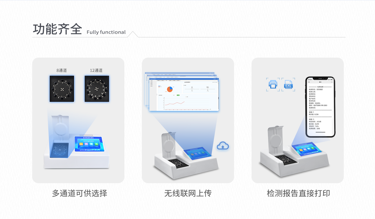 | 安卓智能操作系統(tǒng),采用更加**和人性化操作,儀器具有無線聯(lián)網(wǎng)上傳功能,快速上傳數(shù)據(jù),進(jìn)行數(shù)據(jù)統(tǒng)計(jì)和分析。 | 智能化程度高,儀器具有自檢功能:具有開機(jī)自檢和調(diào)零功能,具有自動檢測重復(fù)性功能;同時,檢測完成可自動打印檢測報告和二維碼。手機(jī)掃碼可顯示出詳細(xì)檢測信息。 | 儀器帶有監(jiān)管平臺,數(shù)據(jù)可局域網(wǎng)和互聯(lián)網(wǎng)數(shù)據(jù)上傳,檢測結(jié)果直接傳至食品安全監(jiān)管平臺。進(jìn)行區(qū)域食品安全監(jiān)管及大數(shù)據(jù)分析處理與數(shù)據(jù)統(tǒng)計(jì),檢測區(qū)域食品安全長短期動態(tài),達(dá)到食品安全問題預(yù)估、預(yù)警 。 | 樣品處理簡單省力,整體操作快速、安全、便捷。 | 儀器具有自身保護(hù)功能,可設(shè)置用戶名及密碼,防止非工作人員操作等。 | 內(nèi)置強(qiáng)大的數(shù)據(jù)庫,可在儀器上直接選擇樣品名稱、檢測指標(biāo)、送檢單位等信息,也可在儀器上直接編輯錄入樣品名稱、檢測指標(biāo)、送檢單位等信息并保存進(jìn)樣品數(shù)據(jù)庫,方便后期操作調(diào)取使用。 | 儀器具有重新校準(zhǔn)、鎖定、恢復(fù)出廠設(shè)置功能。 |