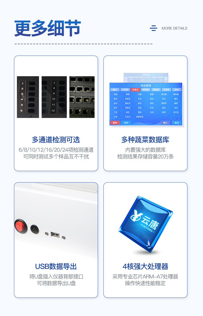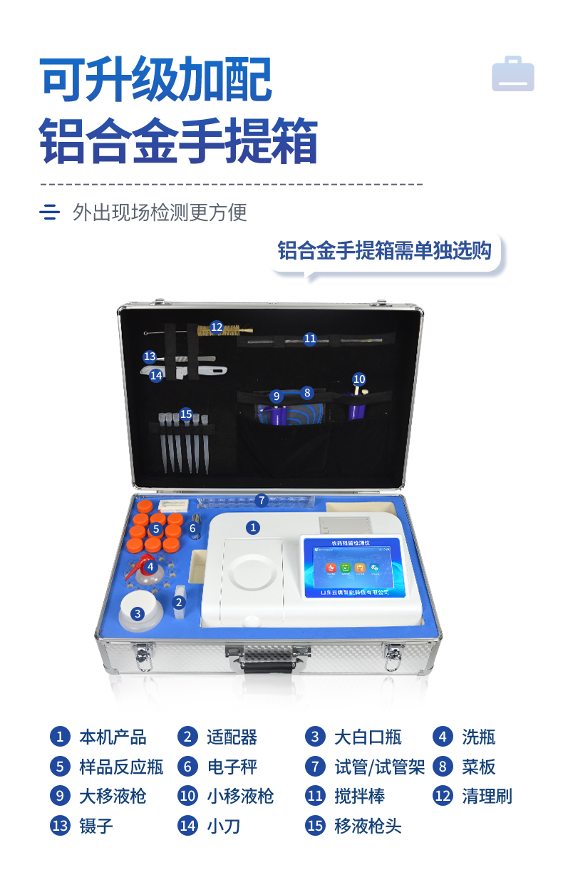 | 乙酰膽堿酯酶和丁酰膽堿酯酶試劑均可以使用,符合國家標準和農業部標準的要求。 | 自動判斷樣品是否合格,檢測結果更加直觀。 | 儀器具有100多種蔬菜名稱菜單庫,分類管理,并可按需添加或刪除蔬菜名,編輯蔬菜名稱,可直接打印出蔬菜名稱。 | 檢測通道:10個檢測通道,可以同時測試多個樣品,循環檢測,即放即檢,每個樣品由程序控制分別獨立工作,不會互相干擾。 | 智能操作系統,采用更加人性化操作,主控采用多核處理器,主頻1.88Ghz,運轉速度更快速,穩定性更強。 | 顯示方式:7英寸高靈敏真彩觸摸屏顯示,人性化中文操作界面,讀數直觀、簡單。 | 打印機采用串口5v打印,可選擇手動打印或者自動打印,三分鐘出打印結果,打印格式為檢測人姓名、吸光度差值、檢測時間、檢測機構、樣品名稱及結果判定。 | 光源采用進口超高亮發光二極管,具有低功耗、高精度、穩定性強、光源可控可以關掉不使用的光源,響應速度快等優點。 | 智能恒流穩壓,光強自動校準,長時間連續工作光源無溫漂現象。 | 儀器具有GPRS遠傳功能,可插手機卡實現數據遠傳平臺,wifi聯網功能,可將數據快速上傳電腦,進行數據管理與統計。 | 采用USB2.0接口設計,方便數據的存貯和移動,并可隨時與計算機直接相連,并且可用計算機控制儀器。實現數據查詢、瀏覽、分析、統計、打印等。 | 智能化程度高,儀器具有自檢功能:具有開機自檢和調零功能,具有自動檢測重復性功能 | 儀器具有自身保護功能,可設置用戶名及密碼,防止非工作人員操作等。 | 采用DC12v直流供電,安全系統更高,并且配備6A鋰電池充電器。 | 儀器具有重新校準、鎖定、恢復出廠設置功能。 |