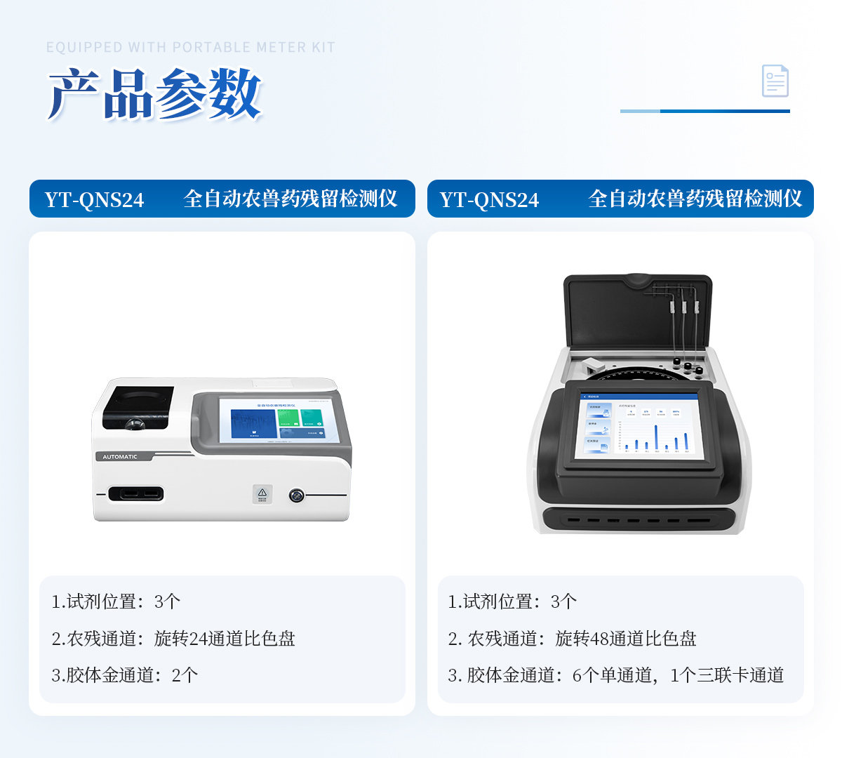 | 1. 試劑位置:3個 | 2. 農殘檢測盤:旋轉24通道比色盤,可任意選擇檢測通道,自動對應選擇通道。 | 3. 膠體金通道:2個,可讀取檢測卡結果,自動采集、處理分析,自動判斷檢測結果,并具備自動判空功能。 | 4.系統配置:10.1寸高清液晶觸摸屏,采用ARM Cortex?-A7,RK3288/4核處理器,運行內存1GB。Android7.1.1 系統分辨率1280×800。 | 5.恒溫系統:具有自動加溫溫控系統,精準恒溫37℃,精度±0.1℃。 | 6.添加系統:儀器按照試劑要求自動、按時、按量加入試劑,并且自動對未正常放置的樣本或異常的樣本進行檢查并提示。 | 7.清洗功能:儀器具備回流及自動清洗管路功能,避免試劑污染。 | 8.混勻功能:設備具備自動混勻功能。 | 9.光源校準:設備可自動校準,確保檢測準確度。 | 10.實時監控:儀器測試過程中屏幕顯示運行狀態,可實時查看。 | 11.數據存儲:內部存儲16GB,可存儲500萬條數據。 | 12.樣品多選功能:設備具備樣品一鍵多選功能,選擇樣品自動匹配檢測通道。 | 13.項目預設:可提前設置單個及多個相同或不相同的檢測任務,可單次或者多次調取,減少檢測時間。 | 14.自定義打印系統:內置自定義打印系統,可按需靈活設置開啟或關閉:產品合格證(國家農業部標準),二維碼,抽樣信息、檢測信息,受檢信息等信息的打印。 | 15.A4版本報告打印功能:設備可自動生成A4版報告,A4報告帶二維碼,可掃描二維碼生成電子版,并可識別真偽。 | 16.傳輸方式:儀器配備無線通信模塊: 4G(APN)通訊模塊、Wifi模塊,藍牙傳輸模塊,同時具有USB接口以及RJ45接口能以多種方式實現數據保存和數據傳輸功能,設備數據可以同步上傳至平臺。 | 17.系統17.數據監管系統:設備自帶監管平臺,并可同步對接監管平臺,數據可局域網和互聯網數據上傳,檢測結果可直接傳至食品安全監管平臺。達到食品安全問題預估、預警。 | 18.系統遠程更新功能:無需設備返廠,即可遠程實時升級全新系統,節省時間成本及避免運輸造成設備損。 |